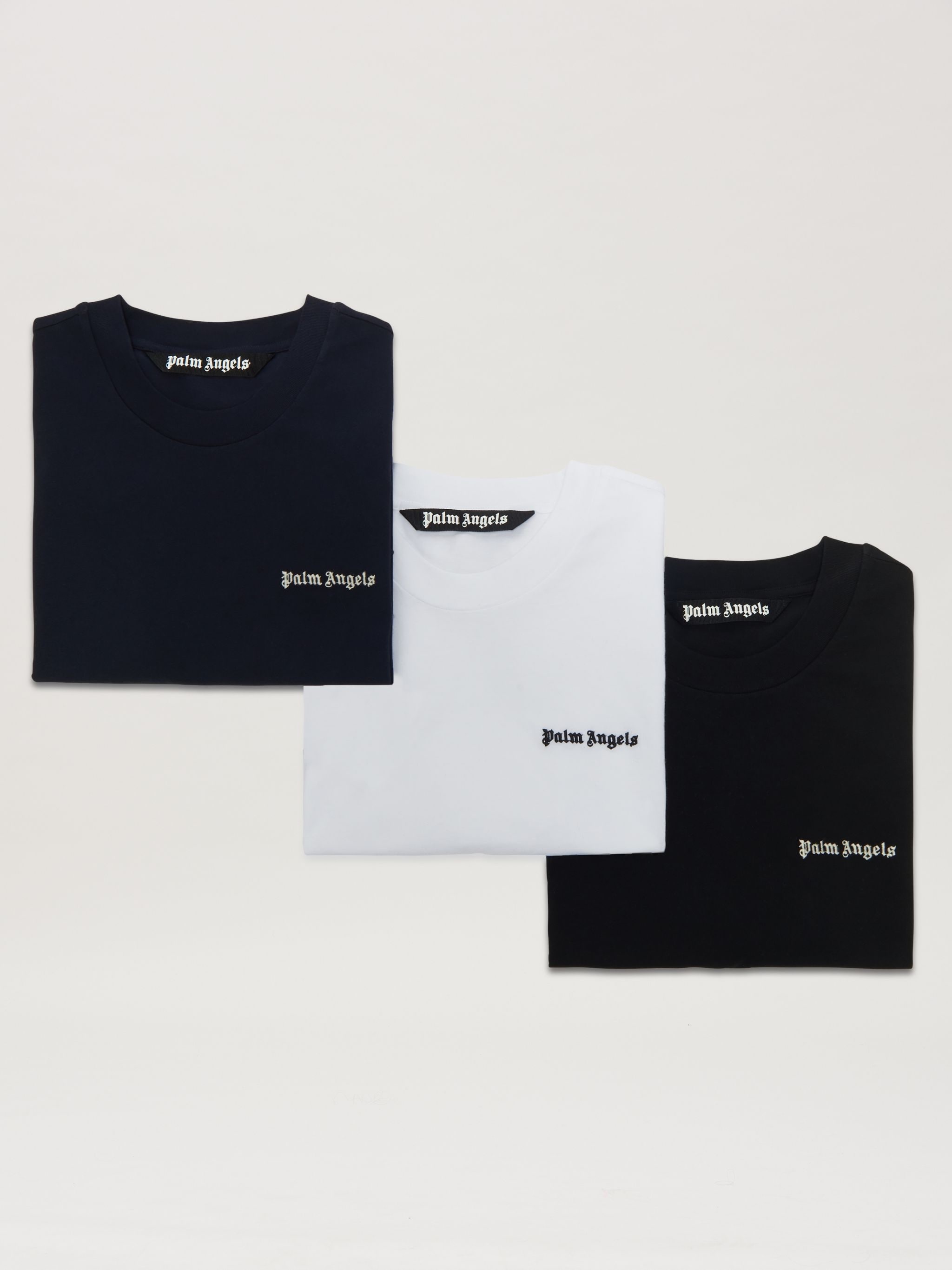 The starting point of every outfit. Pack of three men's short-sleeved T-shirts in blue and black with Palm Angels logo embroidered in white on front and white with Palm Angels logo embroidered in black on front. PRODUCT ID: PMAA093S24JER0028484