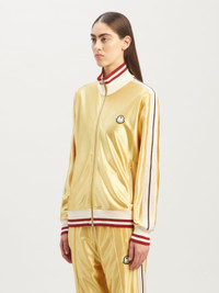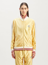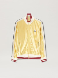 THE LATEST 8 MONCLER PALM ANGELS STORY: ITALIAN LUXURY AND STREET CULTURE COLLIDE IN MIAMI FOR A 90S AMERICANA INSPIRED STORY. TRACK JACKET IN GOLD ACETATE FABRIC WITH "8 MONCLER PALM ANGELS" LOGO PATCH SEWN AT CHEST. RED AND WHITE STRIPED MOTIF AT COLLAR, CUFFS AND HEM. ICONIC BLACK AND WHITE TAPEON THE SLEEVES. TWO ZIPPED POCKETS. RIB KNIT CUFFS, COLLAR AND HEM. SLIM FIT. FABRIC 100% POLYESTER MODEL MARTINA WEARS SIZE S HEIGHT: 5’9" (179CM) BUST: 32" (81CM) WAIST: 24" (61CM) HIPS: 35" (90CM) MODEL PAOLO WEARS SIZE M HEIGHT: 6’2" (188 CM) CHEST: 33" (85 CM) WAIST: 28" (71 CM) HIPS: 36" (91 CM) PRODUCT ID: PMBD047T23FAB0017601