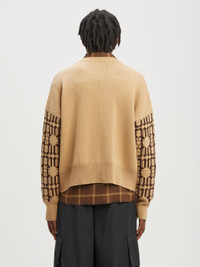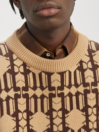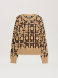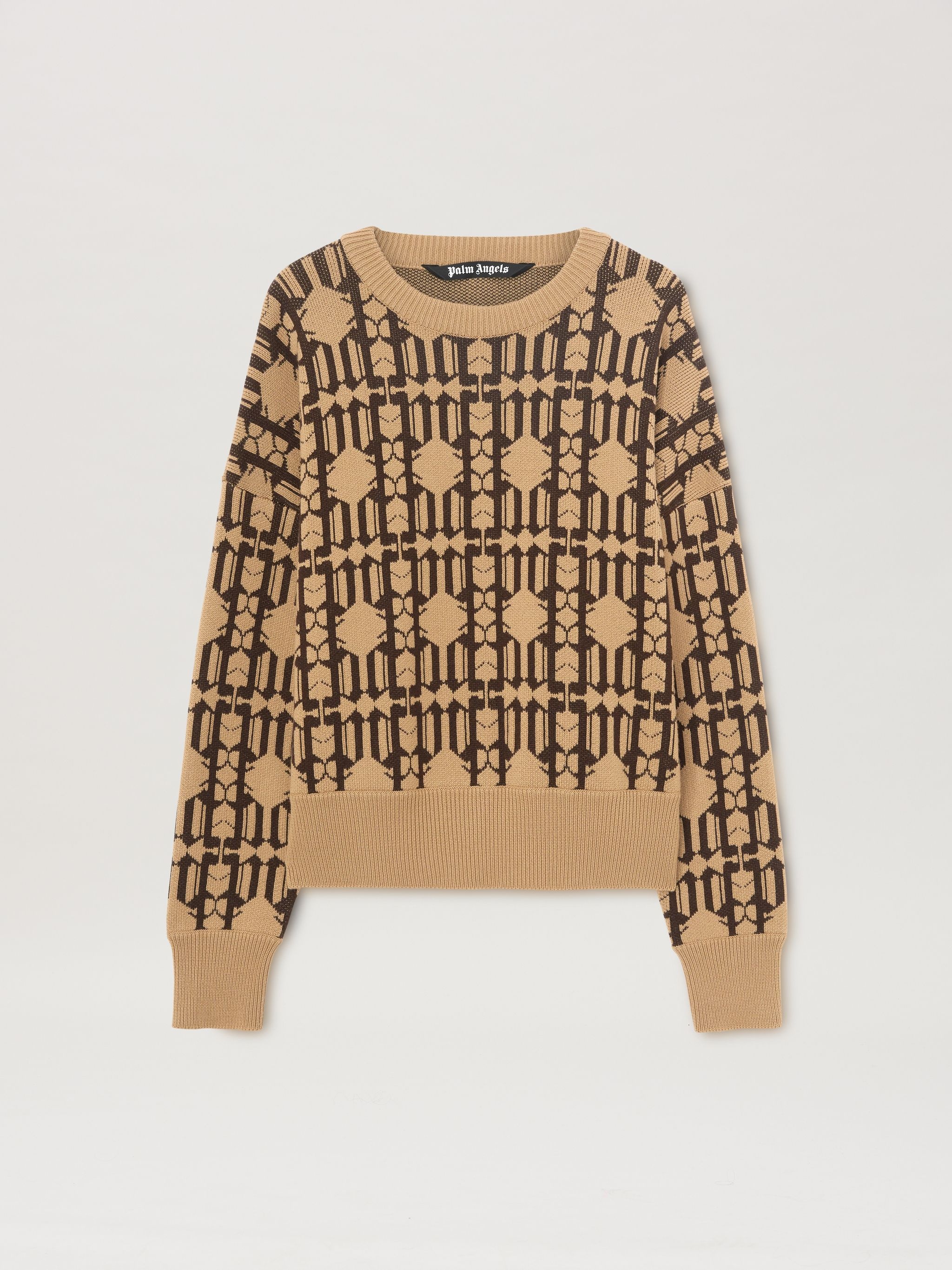 Men's 100% wool beige crewneck knitwear sweater, with boxy fit and Monogram Palm Angels in brown with Art Decò effect. FABRIC 100% VIRGIN WOOL FABRIC 1 100% COTTON DETAIL 100% POLYESTER MODEL PAOLO WEARS SIZE M HEIGHT: 6’2" (188 CM) CHEST: 33'' (85 CM) WAIST: 28'' (71 CM) HIPS: 36" (91 CM) PRODUCT ID: PMHE053E23KNI0016160