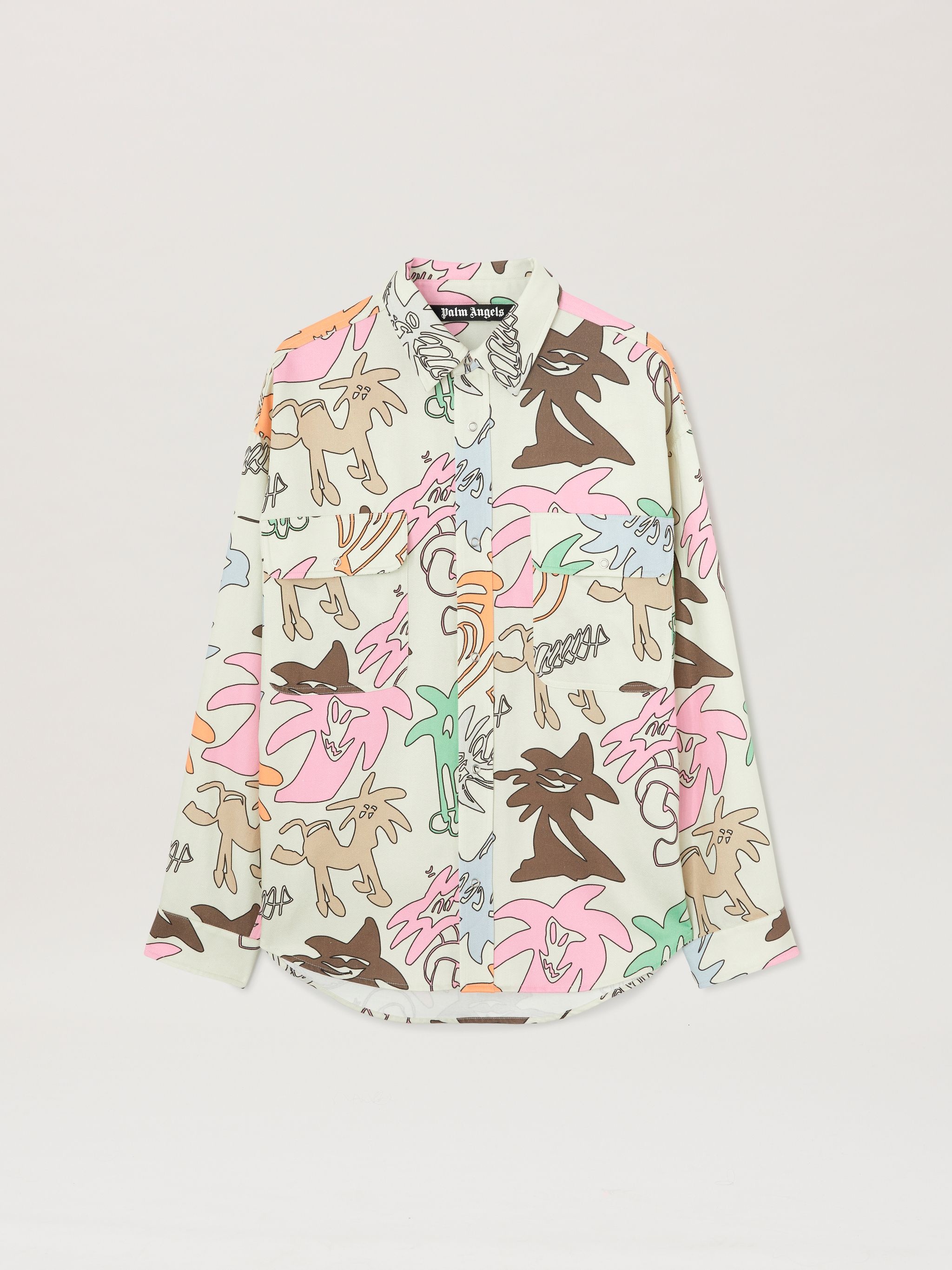 Cream-colored oversized shirt with palm-ou-flage print, featuring palm shaped fantasy characters in different colors, large front pockets with flap. FABRIC 60% LYOCELL 40% COTTON DETAIL 100% POLYESTER MODEL PAOLO WEARS SIZE 48 HEIGHT: 6’2" (188 CM) CHEST: 33'' (85 CM) WAIST: 28'' (71 CM) HIPS: 36" (91 CM) PRODUCT ID: PMGE014E23FAB0020484