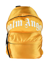 Yellow polyamide backpack Palm Angels. White logo on the front. Small front pocket with black zipper. Large zippered pocket. Black adjustable straps. Black strap. Small size : 28,5 x 42 x 19 cm. Made in Italy.