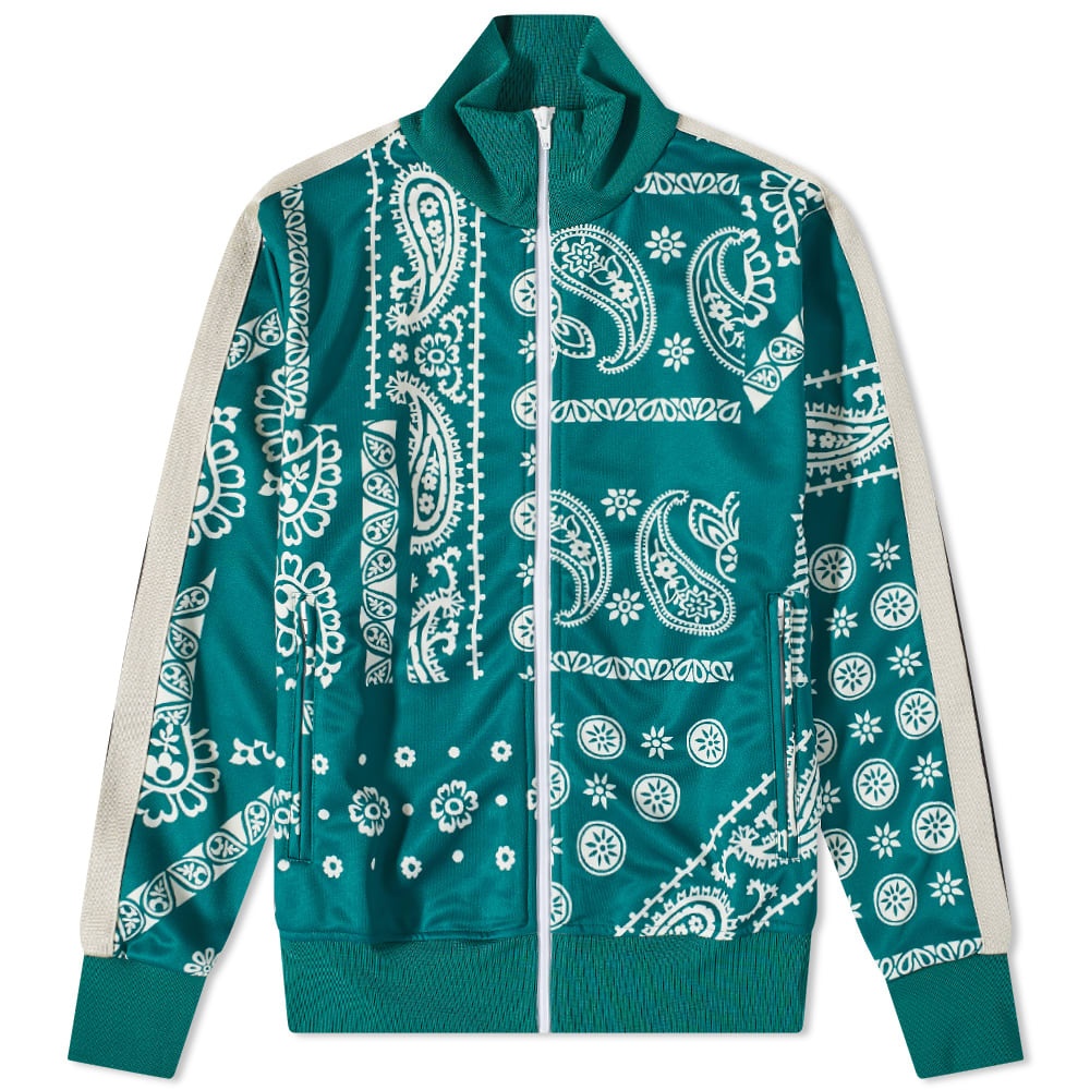 Make a statement with your athleisure wear with this track jacket from Palm Angels. Wrapped in an all-over green and white bandana print, it’s fitted with a funnel neck and accented with white tape detailing down each arm to complete the retro-inspired sporty look. - 100% Polyester - Ribbed Trims - Funnel Neck - Front Zip Closure - 2 Side Zip Pockets - Made in Italy