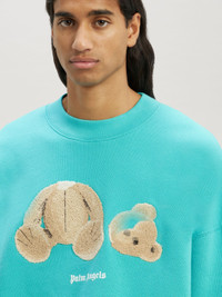 LONG SLEEVES SWEATSHIRT IN TURQUOISE COTTON WITH BEAR GRAPHIC EMBROIDERED AT FRONT. "PALM ANGELS" LOGO PRINTED IN WHITE AT FRONT. CREWNECK COLLAR AND DROP SHOULDERS. FABRIC 100% COTTON MODEL KEVIN WEARS SIZE M HEIGHT: 6’1" (185 CM) CHEST: 36” (92 CM) WAIST: 28” (72 CM) HIPS: 36” (91 CM) PRODUCT ID: PMBA026C99FLE0054360