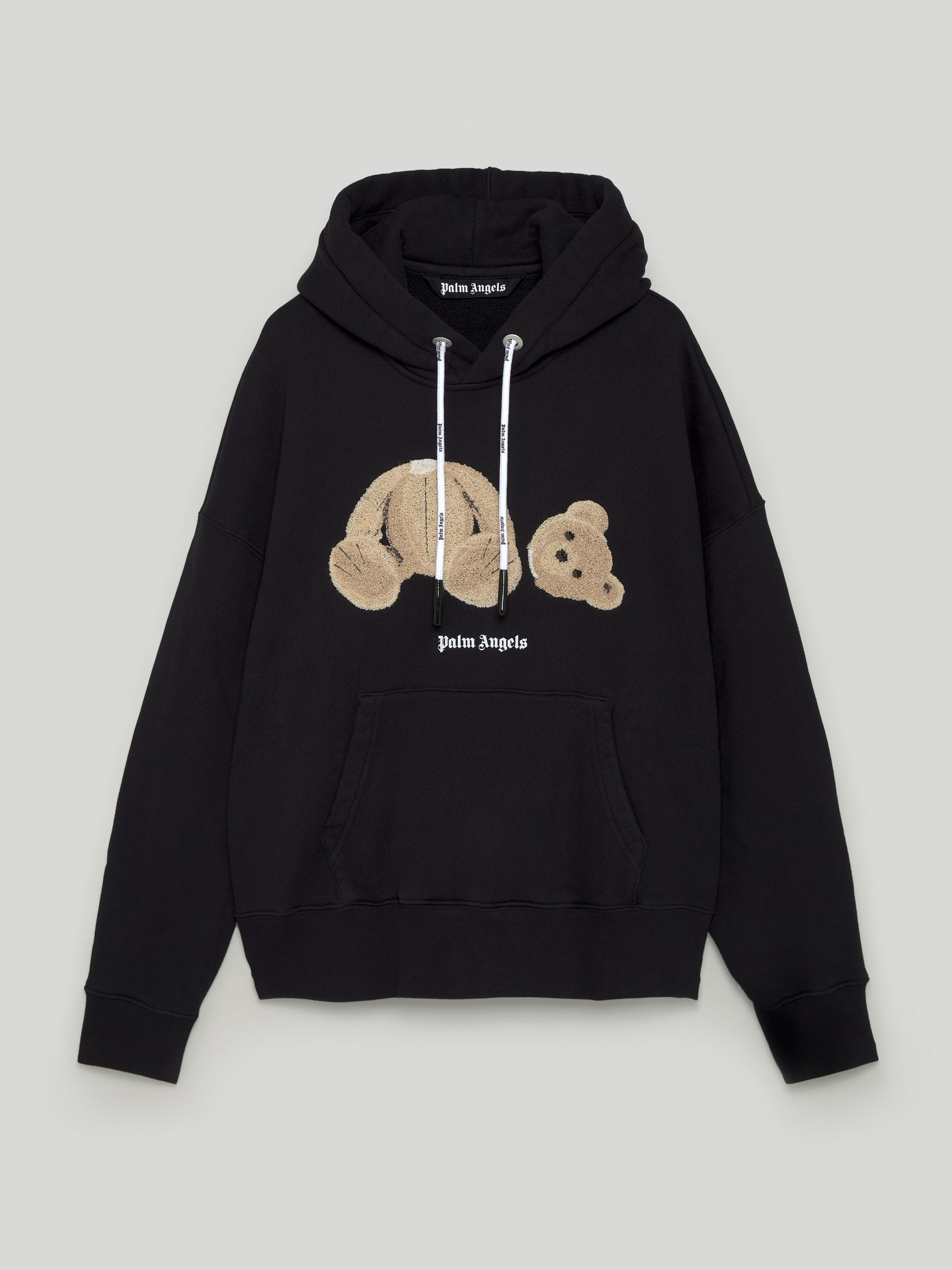 LONG SLEEVES HOODED SWEATSHIRT IN BLACK WITH BEAR PATCH EMBROIDERED AT FRONT. "PALM ANGELS" LOGO PRINTED IN WHITE AT FRONT. WHITE STRINGS FEATURING LOGO PATTERN. KANGAROO POCKET. PRODUCT ID: PMBB058C99FLE0011060