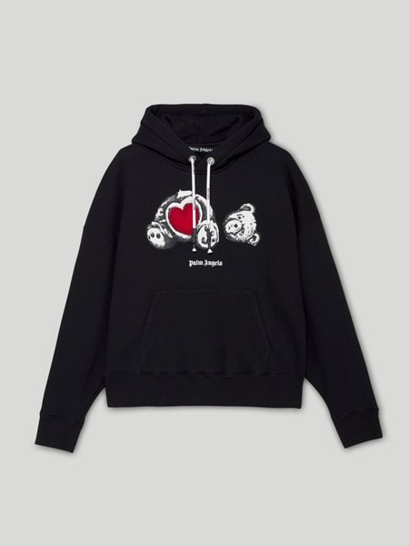 SKU UOMO33643#BLACK WHITE Bear In Love hoodie Characteristic Teddy Bear motif, hood, drop shoulder sleeves, long sleeves, logo print on the chest and front patch pocket. Material: Cotton Blend. Black colour. Produced in Italy Composition Cotton 100%, Acrylic 35%, Wool 35%, Polyester 30% Washing instructions Machine wash Designer ID: PMBB058S21FLE0101001