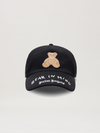 The evolution of a signature character: the teddy bear has an updated status and a dedicated collection, featuring him in different sizes and crafts. Black baseball cap with "fixed" teddy bear patch stitched on the front and motto Bear in Mind and logo Palm Angels embroidered in white on the brim. PRODUCT ID: PMLB108F24FAB0011060