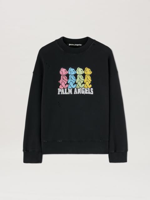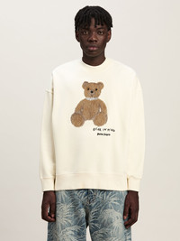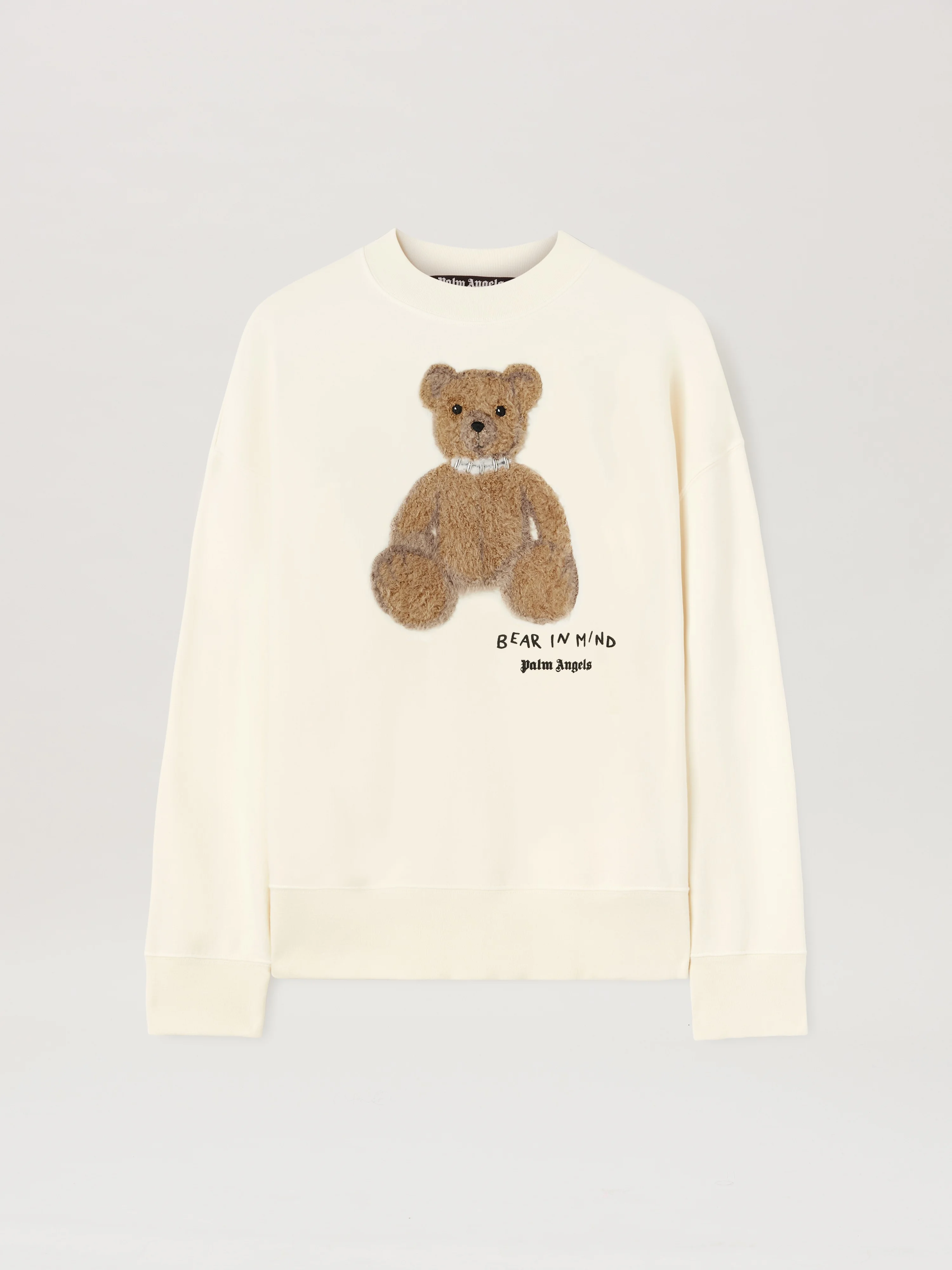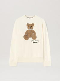 The iconic teddy bear in its punk version returns with new motifs and graphics. Men's white crewneck sweatshirt with teddy bear with stapled neck patch on front and with Bear in Mind graphic and Palm Angels logo printed in black below. DETAILS - Paolo Wears Size M Height: 6' 2” (188 Cm) Bust: 33” (84 Cm) Waist: 27” (70 Cm) Hips: 35” (90 Cm) Detail 1% Acrylic 1% Wool 2% Brass 38% Polyester 58% CottonFabric 100% CottonRib Detail 100% Cotton - Code: PMBA026S25FLE0030360