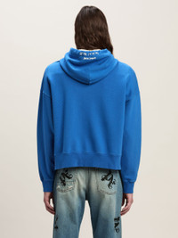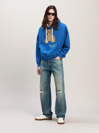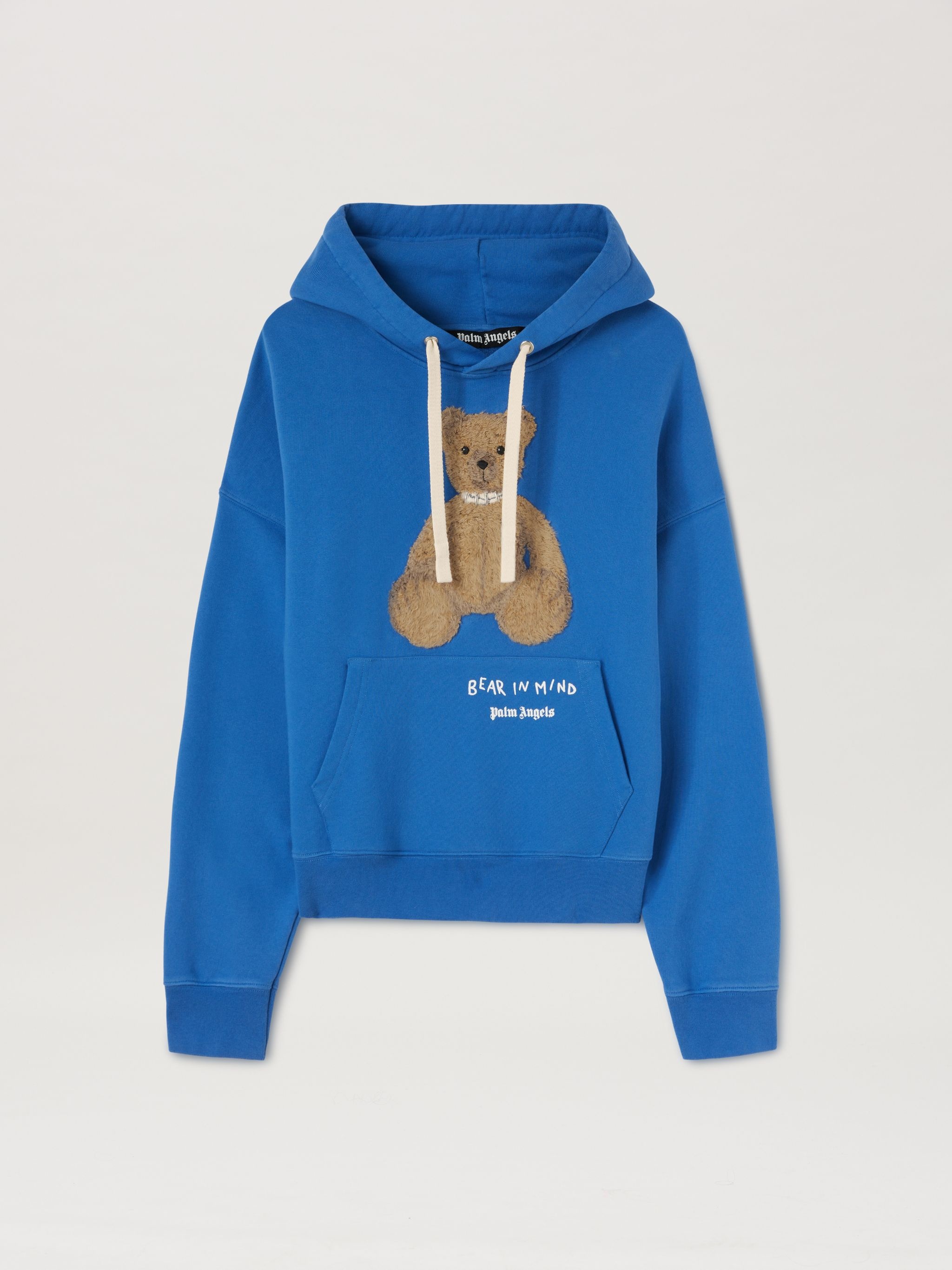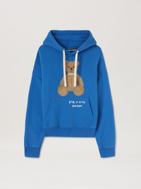 The evolution of a signature character: the teddy bear has an updated status and a matching quote. Men's blue hoodie with teddy bear “fixed” by metal stiching embroidered on the front and Bear in Mind motto and logo Palm Angels printed in white on front pouch pocket and on the back, on the hood. LORENZO WEARS SIZE M HEIGHT: 6' 2" (189 CM) BUST: 36" (92 CM) WAIST: 28" (71 CM) HIPS: 34" (86 CM) PRODUCT ID: PMBB167F24FLE0014560