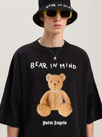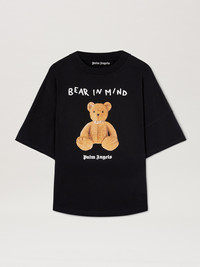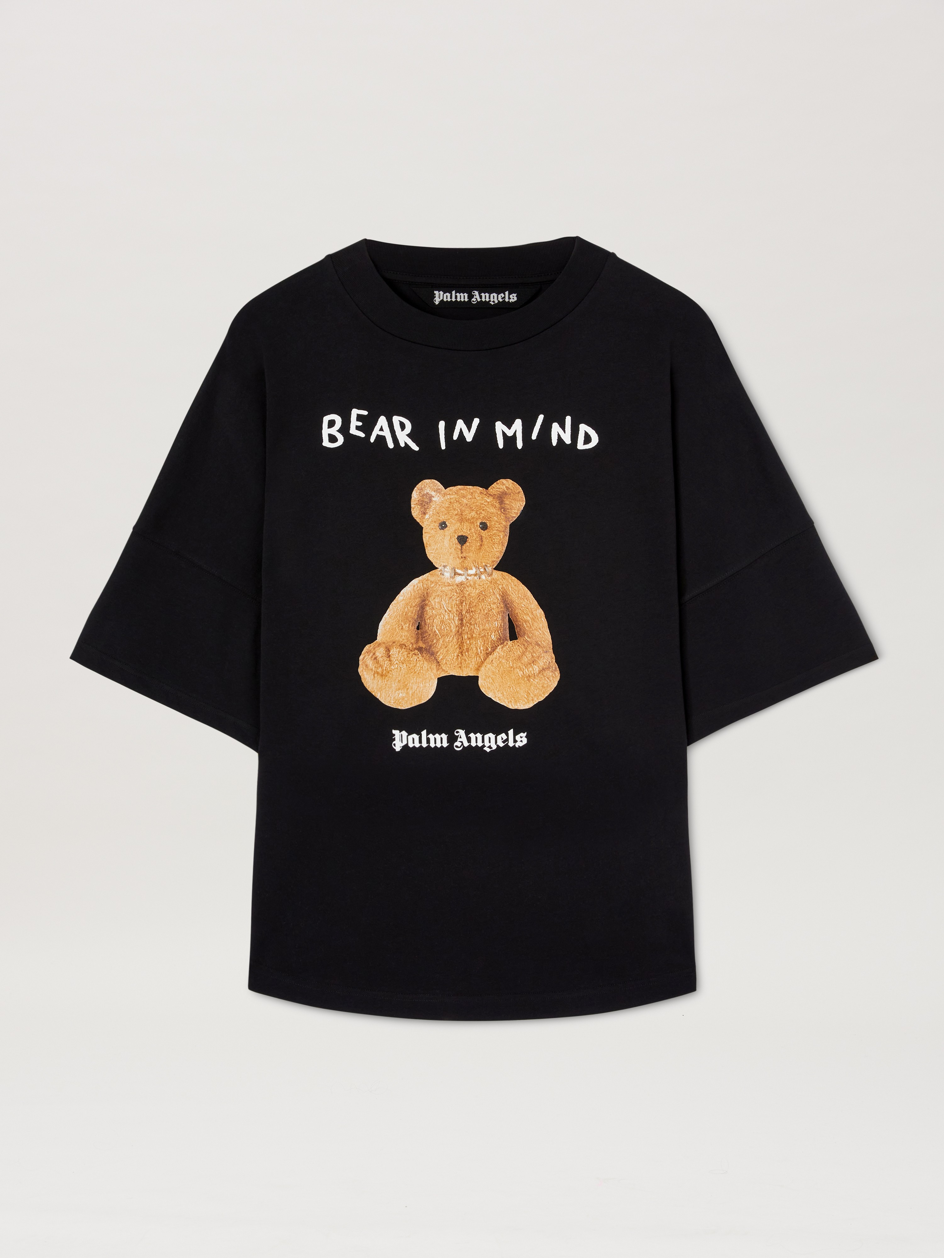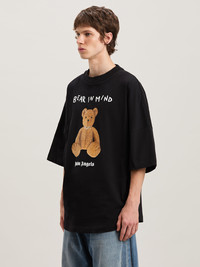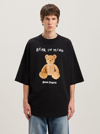 The iconic teddy bear in its punk version is back with new motifs and graphics. Black oversized short-sleeved men's T-shirt featuring teddy bear with stapled neck glossy screen-printed on front, Bear in Mind graphic printed in white above and Palm Angels logo printed in white below. MANUEL WEARS SIZE M HEIGHT: 6' 1” (185 CM) BUST: 34.5” (87 CM) WAIST: 26” (66 CM) HIPS: 33” (85 CM) PRODUCT ID: PMAA002S25JER0021060