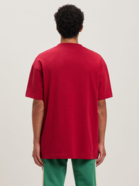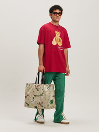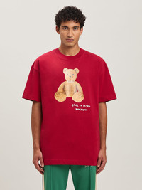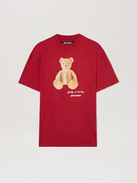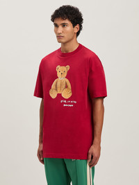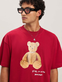 The iconic teddy bear in its punk version returns with new motifs and graphics. Men's red short-sleeved T-shirt with teddy bear with stapled neck glossy screenprinted on front, and with Bear in Mind graphic and Palm Angels logo printed in white below. SALAH WEARS SIZE M HEIGHT: 6' 0” (183 CM) BUST: 37.5” (95 CM) WAIST: 30” (76 CM) HIPS: 36” (91 CM) PRODUCT ID: PMAA001S25JER0052560