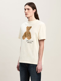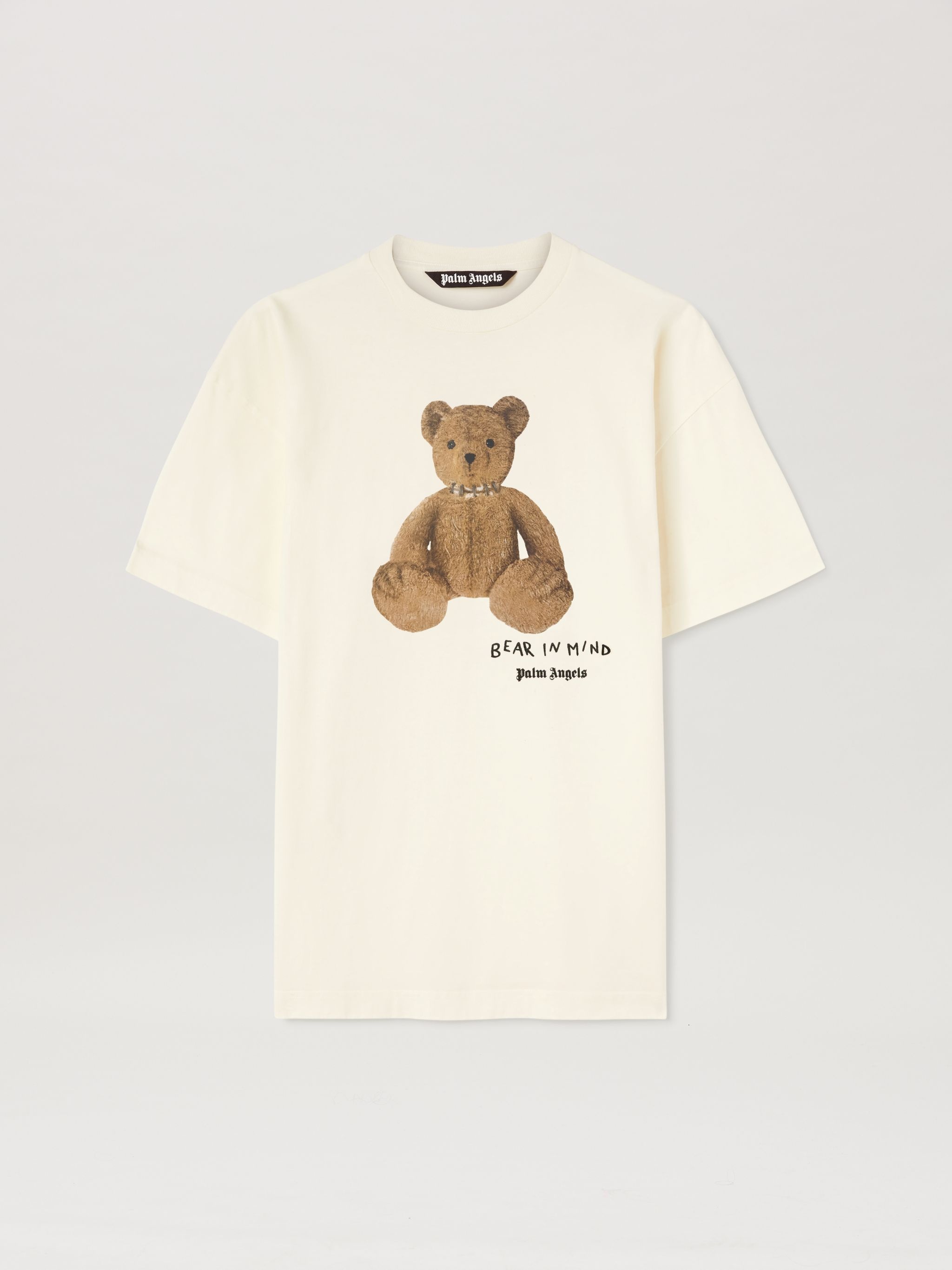 The evolution of a signature character: the teddy bear has an updated status and a matching quote. Men's white short-sleeved T-shirt with print of teddy berar “fixed” by metal stiching on the front and motto Bear in Mind and logo Palm Angels in black below. LORENZO WEARS SIZE M HEIGHT: 6' 2" (189 CM) BUST: 36" (92 CM) WAIST: 28" (71 CM) HIPS: 34" (86 CM) PRODUCT ID: PMAA001F24JER0100360
