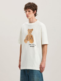 The iconic teddy bear in its punk version returns with new motifs and graphics. Men's white short-sleeved T-shirt with front glossy screen-printed teddy bear with stapled neck, Bear in Mind graphic and Palm Angels logo printed in black below. MANUEL WEARS SIZE M HEIGHT: 6' 1” (185 CM) BUST: 34.5” (87 CM) WAIST: 26” (66 CM) HIPS: 33” (85 CM) PRODUCT ID: PMAA001S25JER0050360
