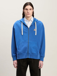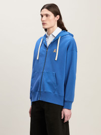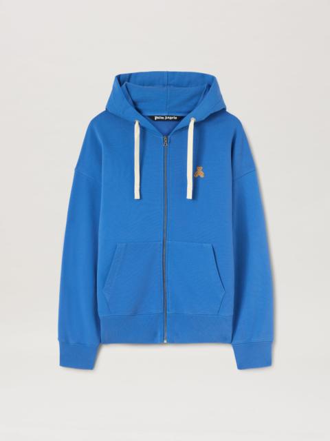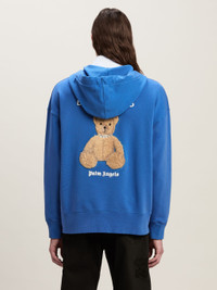 The evolution of a signature character: the teddy bear has an updated status and a matching quote. Men's blue zipped hoodie with small teddy bear embroidered on the front and big teddy bear “fixed” by metal stiching embroidered on the back with Bear in Mind motto printed in white above and logo Palm Angels printed in white below. LORENZO WEARS SIZE M HEIGHT: 6' 2" (189 CM) BUST: 36" (92 CM) WAIST: 28" (71 CM) HIPS: 34" (86 CM) PRODUCT ID: PMBE021F24FLE0014560