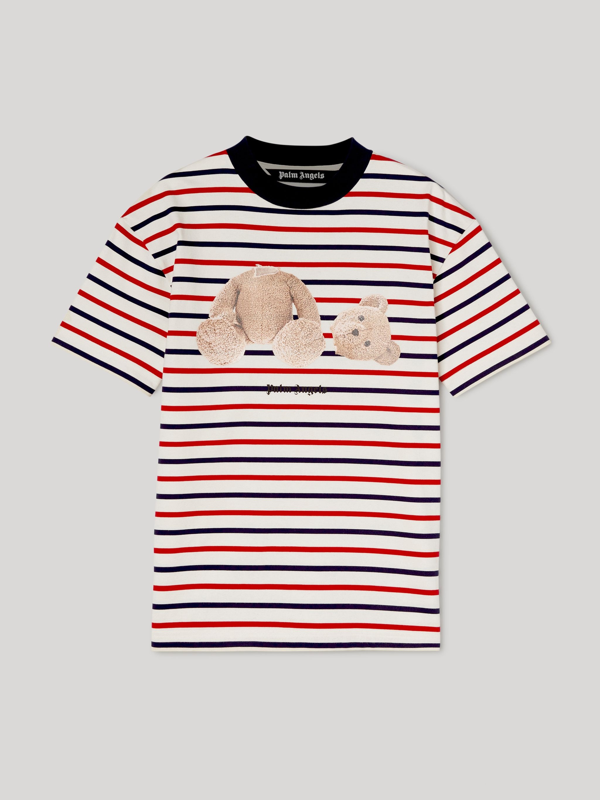SHORT SLEEVES STRIPED T-SHIRT IN RED AND BLUE. BEAR GRAPHIC PRINTED AT FRONT. "PALM ANGELS" LOGO PRINTED IN BLACK AT FRONT AND AT BACK. CREWNECK COLLAR. FABRIC 100% COTTON MODEL NICCOLÒ WEARS SIZE M HEIGHT: 6'2 (187 CM) CHEST: 31" (80 CM) WAIST: 28" (72 CM) HIPS: 36" (91 CM) PRODUCT ID: PMAA001S22JER0122560