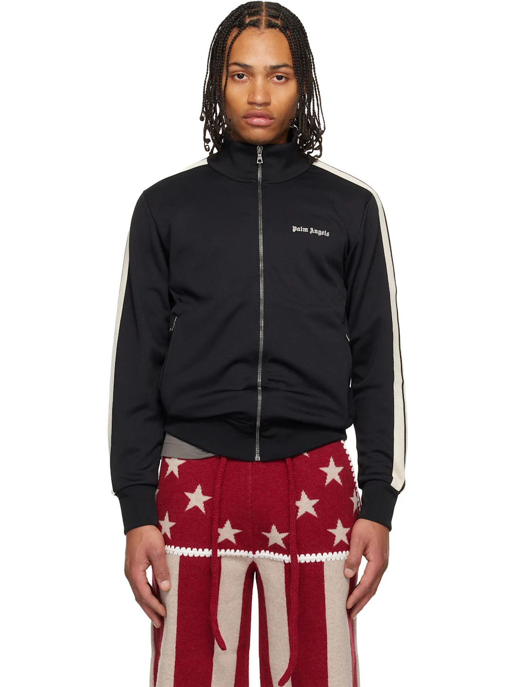 Interlock jersey track jacket. · Rib-knit stand collar, hem, and cuffs · Zip closure · Logo embroidered at chest · Zip pockets · Striped knit trim at sleeves Supplier color: Black/Off-white Body: 100% polyester. Trim 1: 96% polyester, 4% elastane. Trim 2: 100% polyester. Pocket lining: 100% polyester. Made in Portugal 252695M202000