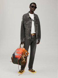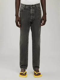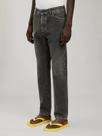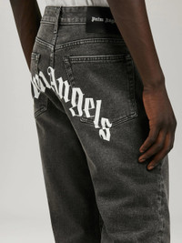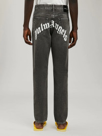 LONG DENIM PANTS IN BLACK FADED WASH. WHITE "PALM ANGELS " LOGO PRINTED AT BACK. BUTTON CLOSURE. ZIP FLY. BELT LOOPS. FABRIC 100% COTTON MODEL MASSAER WEARS SIZE 32 HEIGHT: 6'1 (185 CM) CHEST: 31" (80 CM) WAIST: 24" (62 CM) HIPS: 34" (86 CM) PRODUCT ID: PMYA012C99DEN0011001