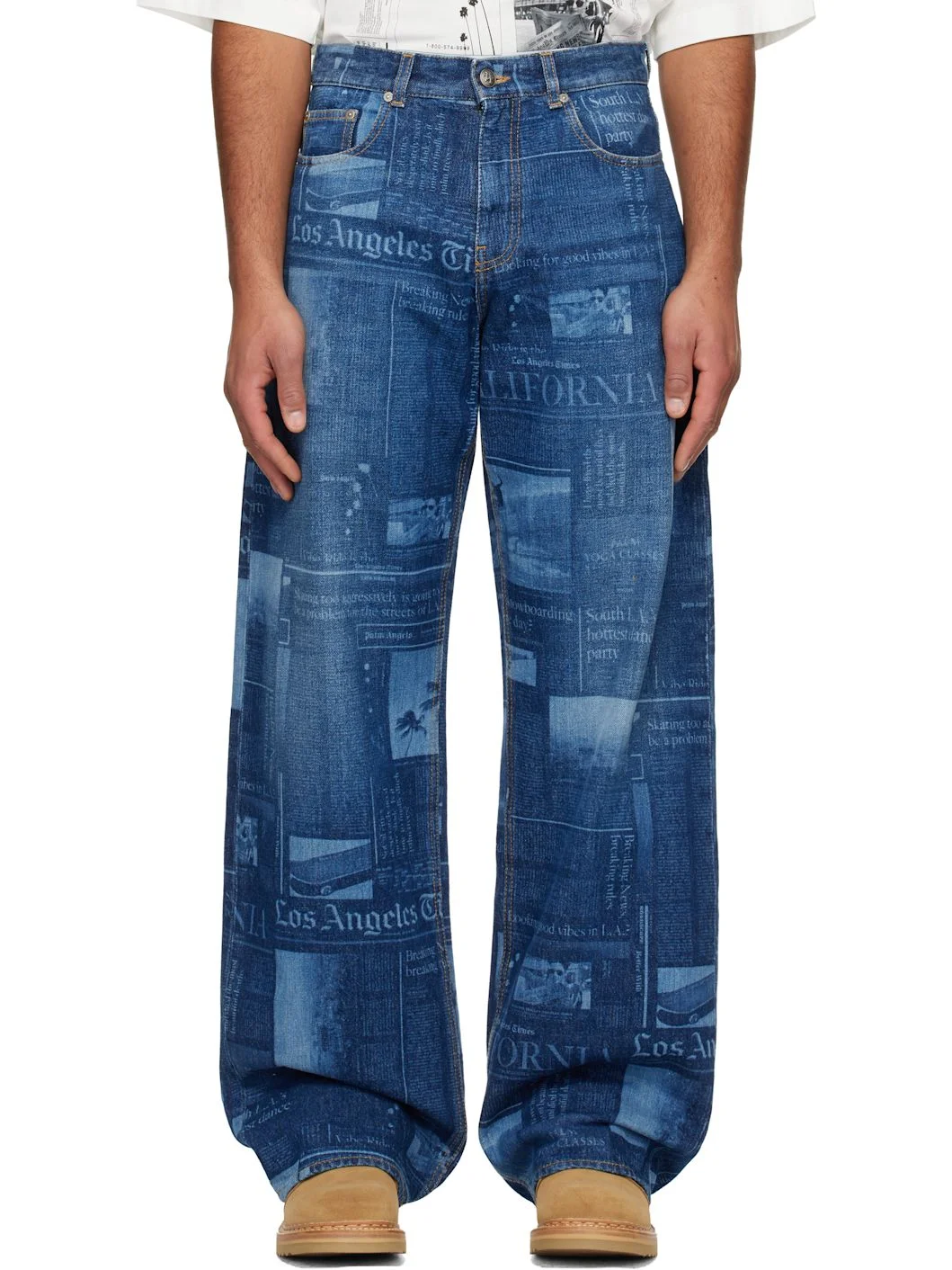 Loose-fit non-stretch denim jeans. · Faded graphic pattern throughout · Belt loops · Five-pocket styling · Zip fly · Leather logo patch at back waistband · Contrast stitching in tan Part of the Palm Angels x Los Angeles Times collaboration. Supplier color: Medium blue/Dusty blue Body: 100% cotton. Pocket lining: 65% cotton, 35% polyester. Made in Italy 252695M186001