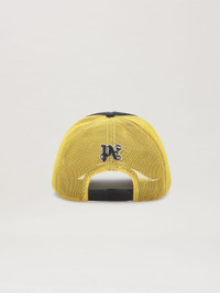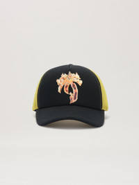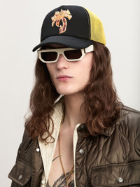 Styling one's outfit from the top. Trucker hat with black cotton front and brim and yellow gold mesh back and with palm tree in flames printed on front and black Monogram printed in black on the back. PRODUCT ID: PMLB105F24FAB0021076