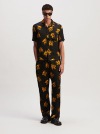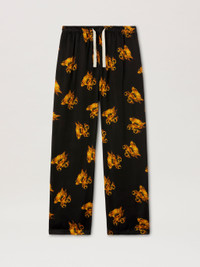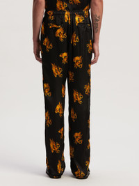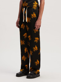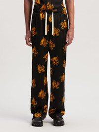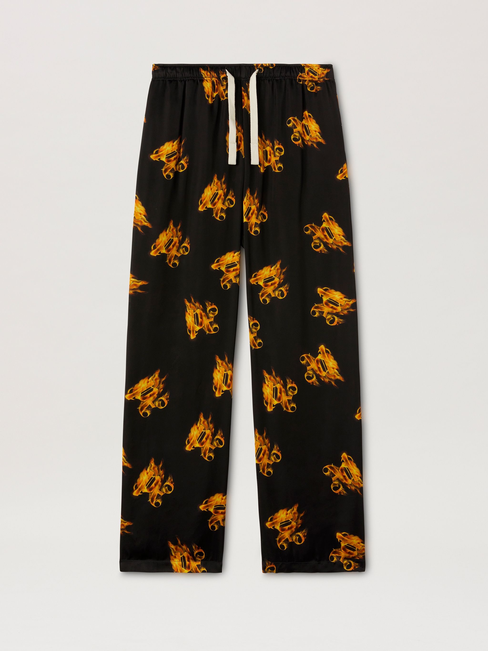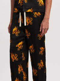 To add an extra sparkle to everyday wear. Men's black loose-fitting pants with elastic and drawstring waistband, featuring Burning Monogram pattern with gold flames printed on a black background, and button pockets on the back. Denzel wears size 48 Height: 6' 25" (190 cm) Bust: 36" (91 cm) Waist: 28" (72 cm) Hips: 35" (88 cm) PRODUCT ID: PMCA143R24FAB0021076