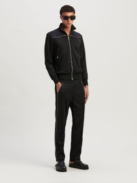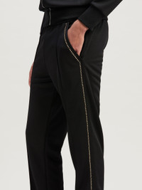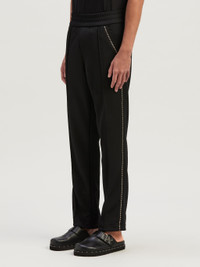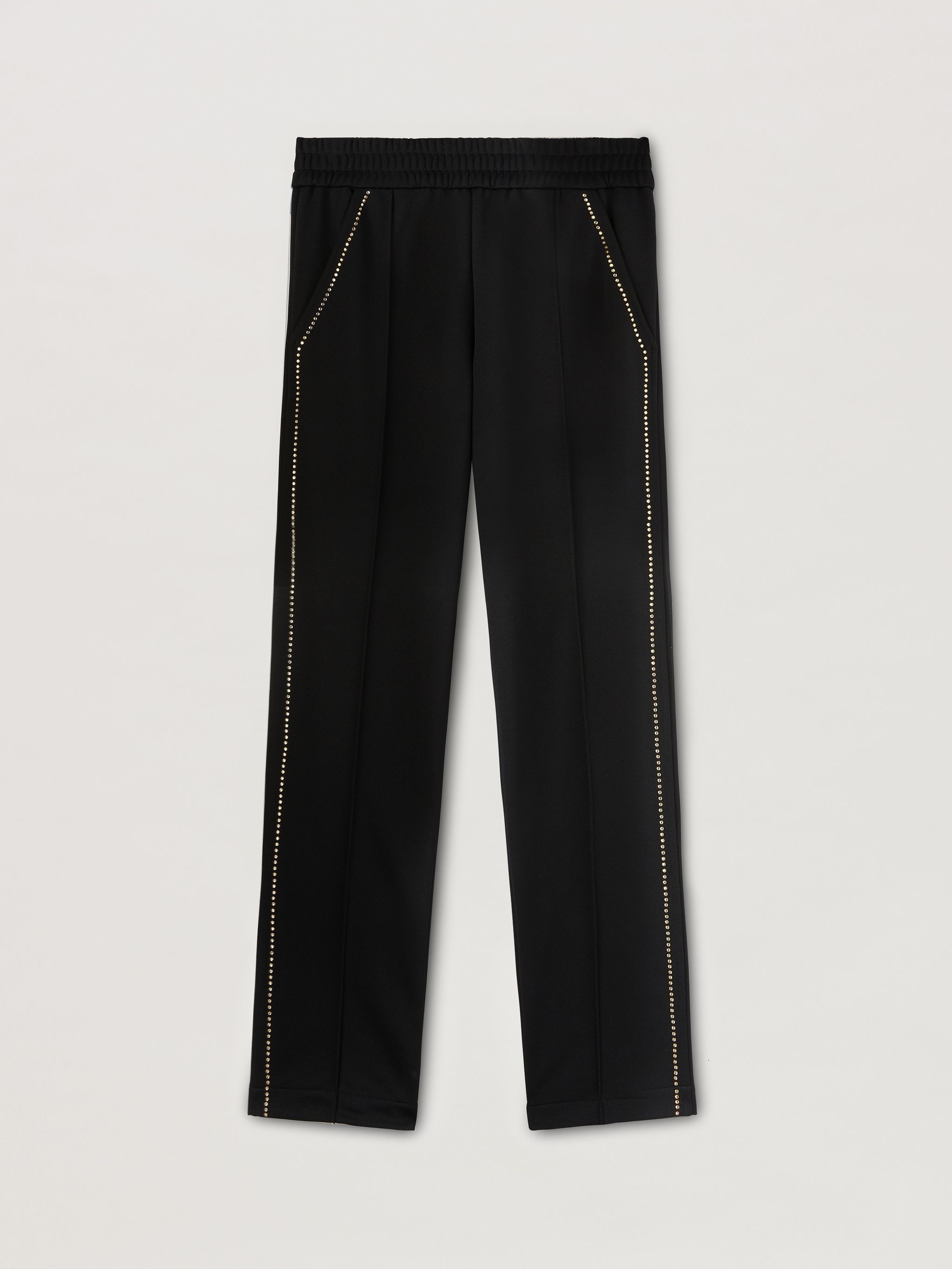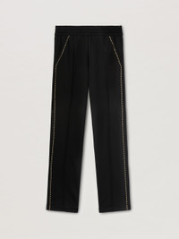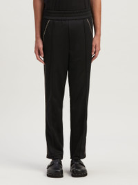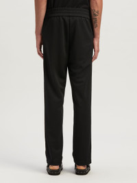 A new take on an identity garment. Men's black tracksuit pants with elastic waistband, featuring pocket piping and side band embroidered with silver mini studs. Denzel wears size M Height: 6' 25" (190 cm) Bust: 36" (91 cm) Waist: 28" (72 cm) Hips: 35" (88 cm) PRODUCT ID: PMCJ029R24FAB0011072