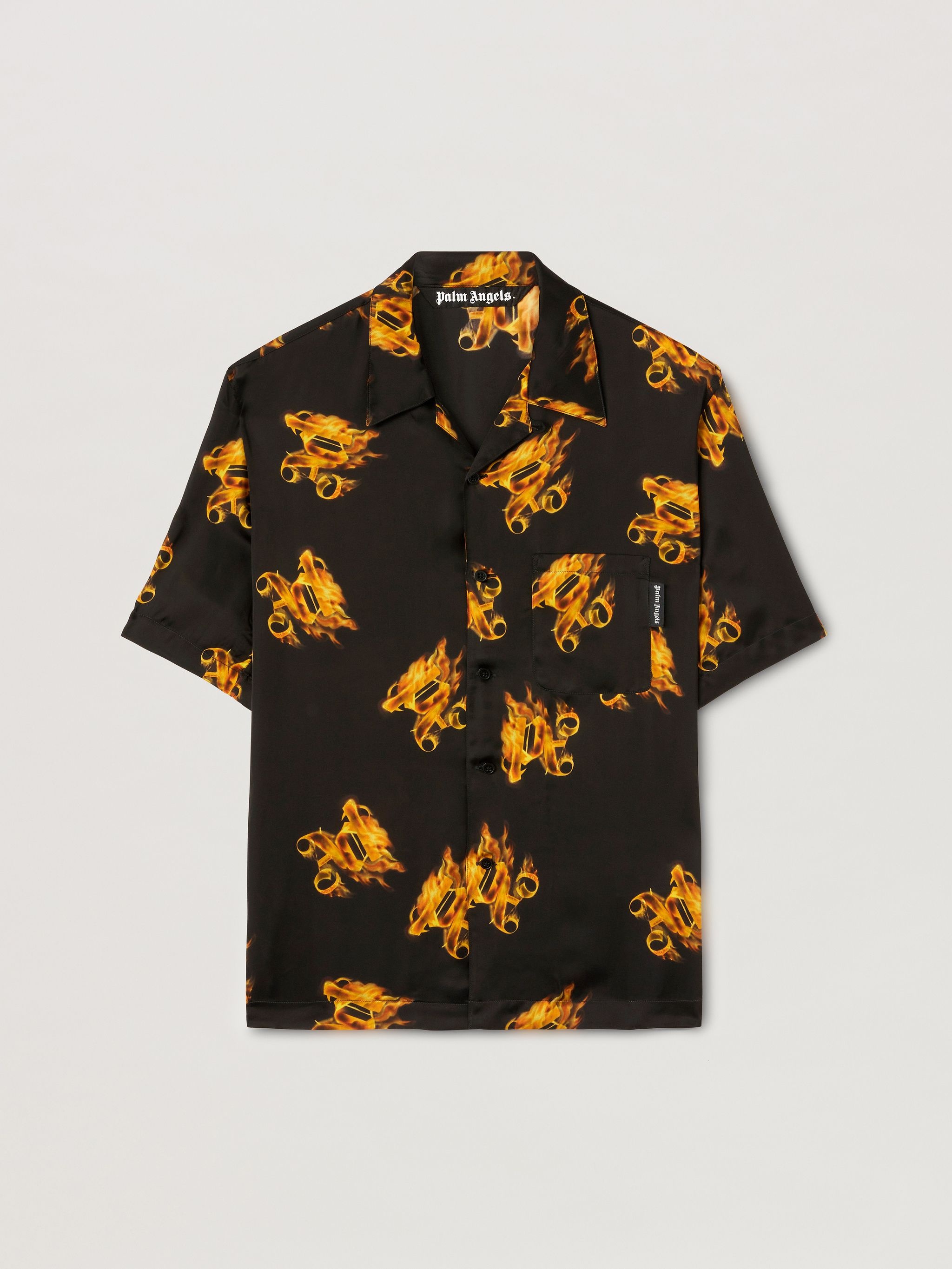 Easy design brightened up by lively prints. Men's short-sleeved bowling shirt with Burning Monogram print with gold flames on black background. Denzel wears size 48 Height: 6' 25" (190 cm) Bust: 36" (91 cm) Waist: 28" (72 cm) Hips: 35" (88 cm) PRODUCT ID: PMGG005R24FAB0021076