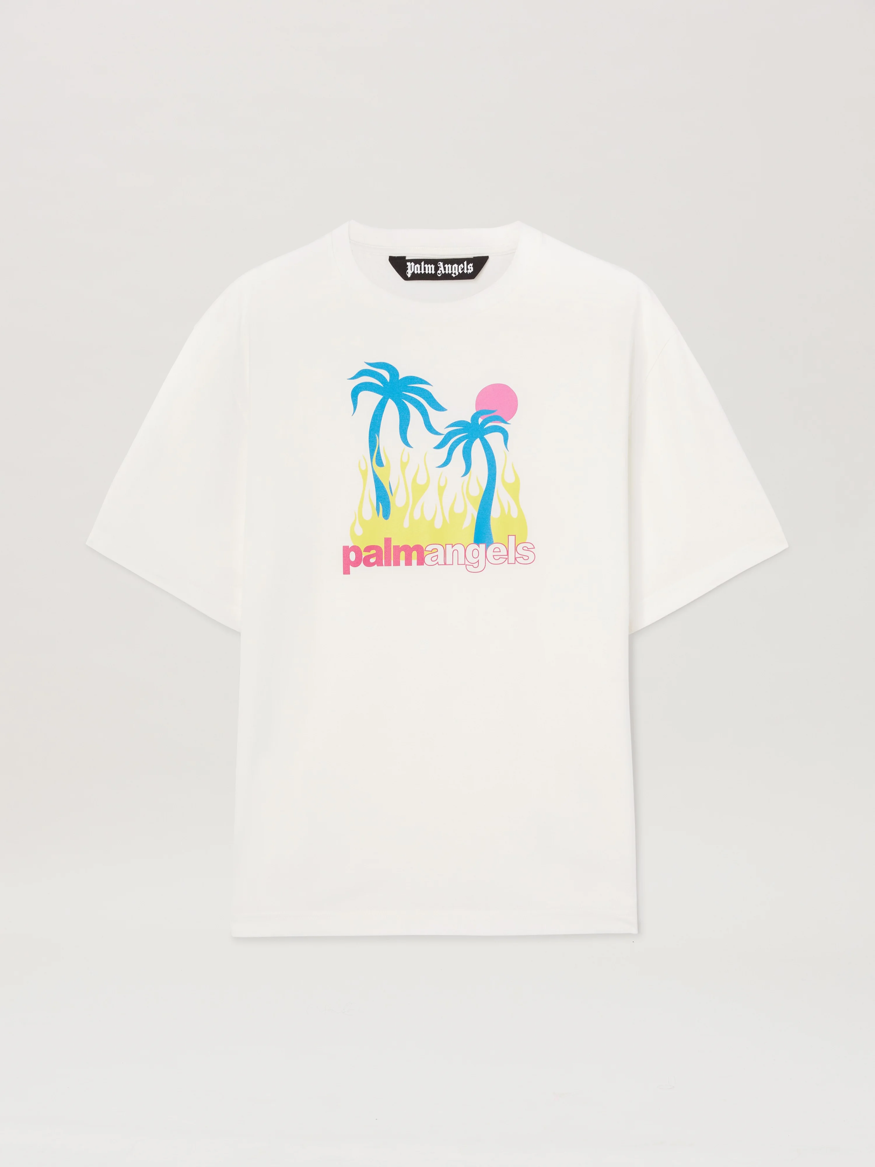 Combining palm trees and flames in a new glossy print. Men's white short sleeves T-shirt with front print of palm tree oasis with sky blue palm trees among yellow flames and with Palm Angels lettering inscribed on bottom. PRODUCT ID: PMAA089S25JER0020384