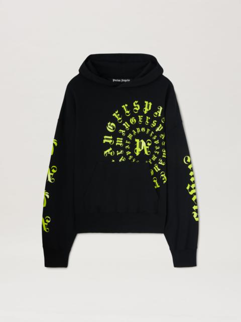 One of the motifs that cross the seasons, the buring flames, returns in a gold version and also wraps the gothic logo. Men's black hoodie with pouch pocket and palm tree in flames printed in the front. On the back vertically printed gothic logo with flame effect letters. LORENZO WEARS SIZE M HEIGHT: 6' 2" (189 CM) BUST: 36" (92 CM) WAIST: 28" (71 CM) HIPS: 34"" (86 CM) PRODUCT ID: PMBB058F24FLE0051076