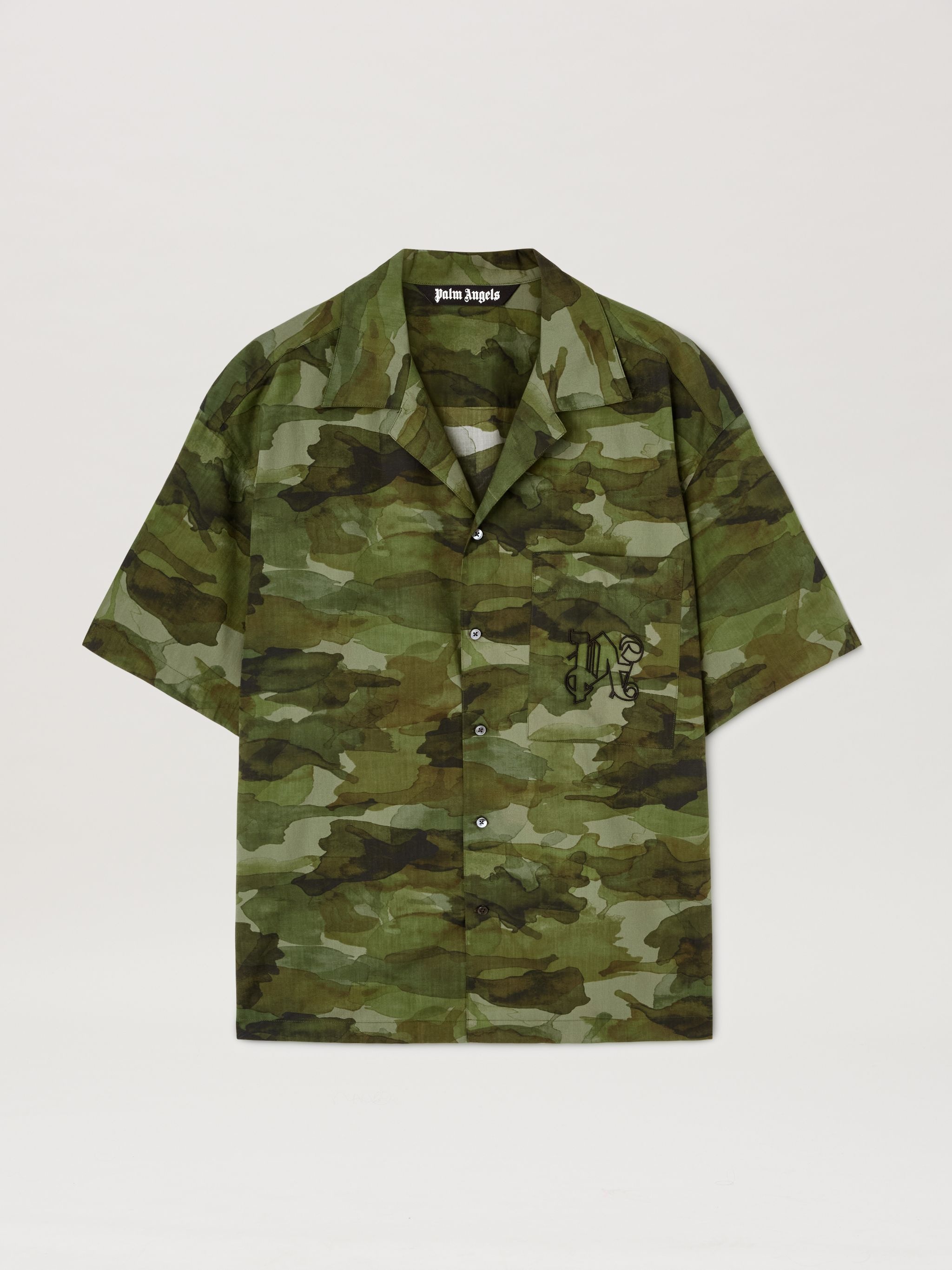 A distinctive seasonal print: a watercolor camouflage that lightens the “earthy” nature of the pattern. Men's short-sleeved shirt with open collar and Monogram embroidered in black on the breast pocket. LORENZO WEARS SIZE 48 HEIGHT: 6' 2" (189 CM) BUST: 36" (92 CM) WAIST: 28" (71 CM) HIPS: 34"" (86 CM) PRODUCT ID: PMGG007F24FAB0055610