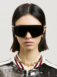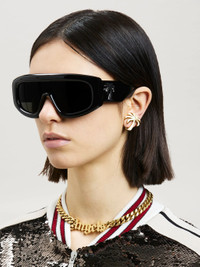 MASK SUNGLASSES IN BLACK WITH BLACK LENSES. SILVER PALM TREE LOGO AT SIDES. MATERIAL 90% ACETATE 10% METAL PRODUCT ID: PERI016F22PLA0011007