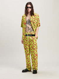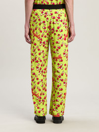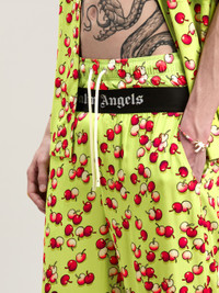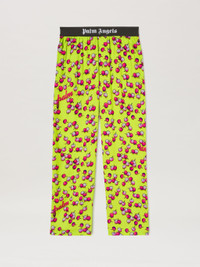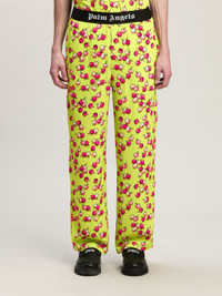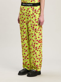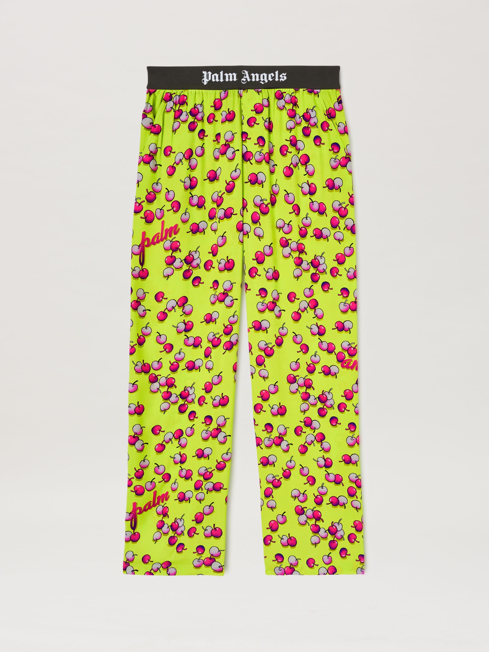 An exuberant flourish of prints to give a new seasonal flavor to basics. Men's pajama pants with fuchsia and white cherry print on a lime green background and Palm Angels pop-up lettering in fuchsia. Black elastic waistband with Palm Angels logo in white. DETAIL 10% ELASTAN 23% POLYESTER 67% POLYAMIDE - FABRIC 100% VISCOSE LORENZO WEARS SIZE M HEIGHT: 6' 2" (189 CM) BUST: 36" (92 CM) WAIST: 28" (71 CM) HIPS: 34" (86 CM) PRODUCT ID: PMCA111F24FAB0025432