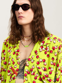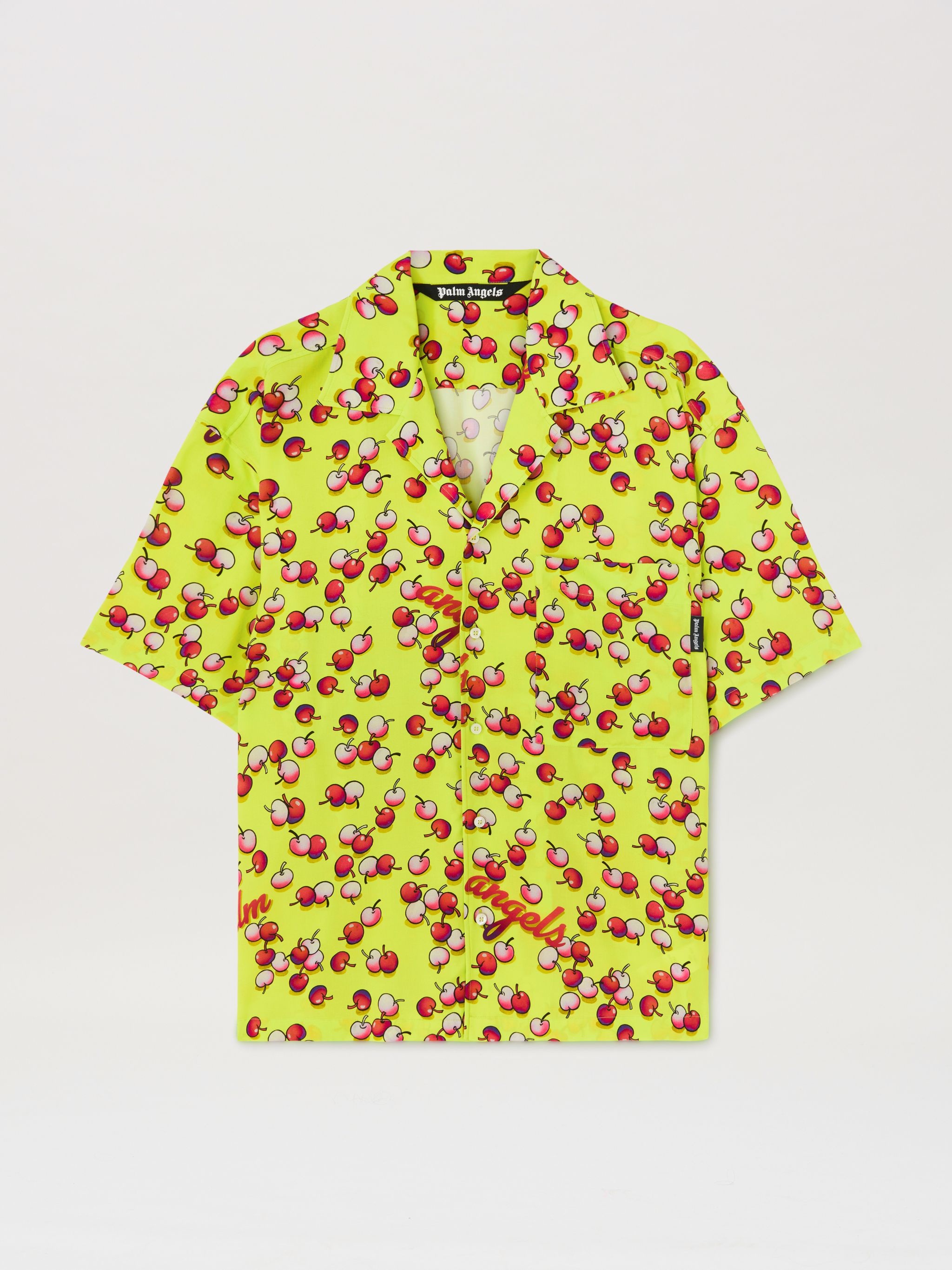 Exuberant prints to give a new seasonal flavor to the basics. Men's bowling short sleeved shirt with fuchsia and white cherry print on lime green background, front breast pocket and Palm Angels pop-up lettering in fuchsia. FABRIC 100% VISCOSE LORENZO WEARS SIZE 48 HEIGHT: 6' 2" (189 CM) BUST: 36" (92 CM) WAIST: 28" (71 CM) HIPS: 34" (86 CM) PRODUCT ID: PMGG007F24FAB0015432