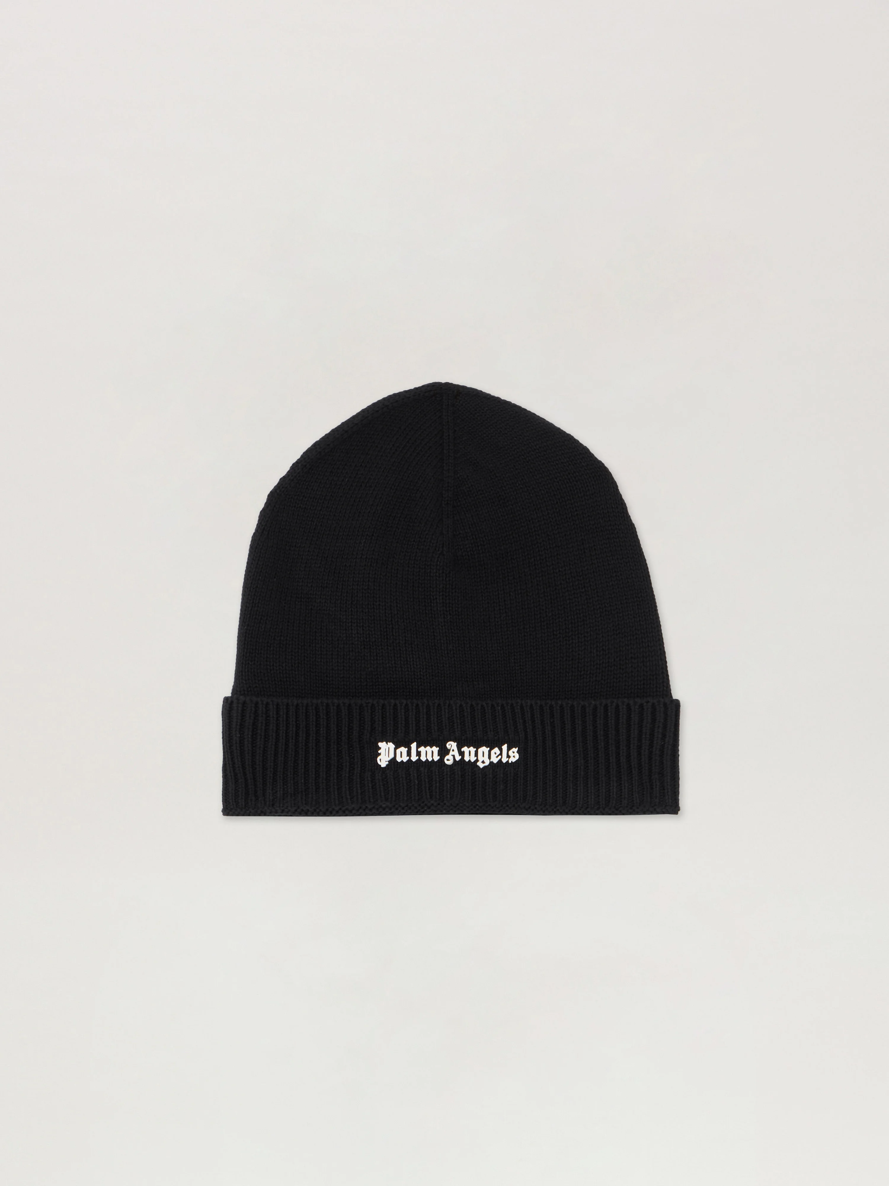 BEANIE IN BLACK WOOL WITH "PALM ANGELS" LOGO EMBROIDERED IN WHITE AT FRONT. REGULAR FIT. FABRIC 90% COTTON 10% CASHEMERE - DETAIL 20% POLYURETHANE 80% POLYESTER PRODUCT ID: PMLC002C99KNI0011001
