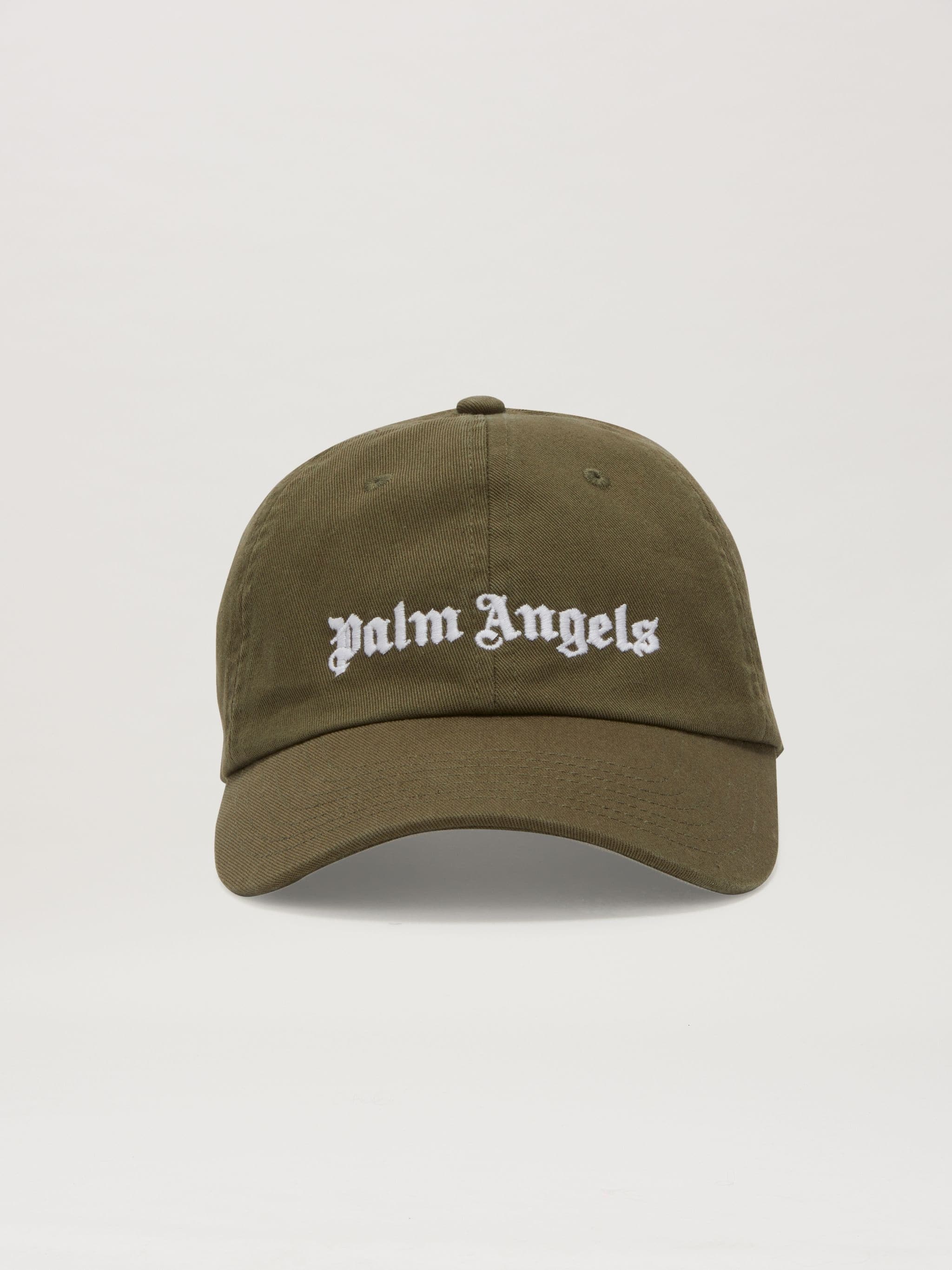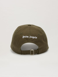 CAP IN MILITARY GREEN COTTON WITH "PALM ANGELS" LOGO EMBROIDERED IN WHITE ON FRONT. ADJUSTABLE CINCH STRAP AT BACK. FABRIC 100% COTTON - EMBROIDERY 100% COTTON PRODUCT ID: PMLB003C99FAB0015501
