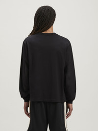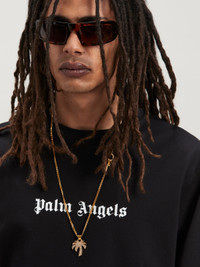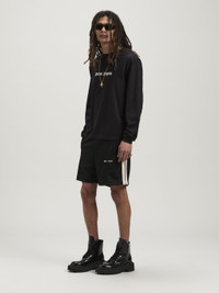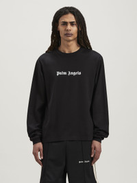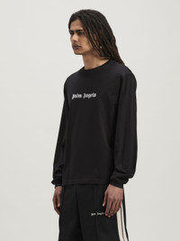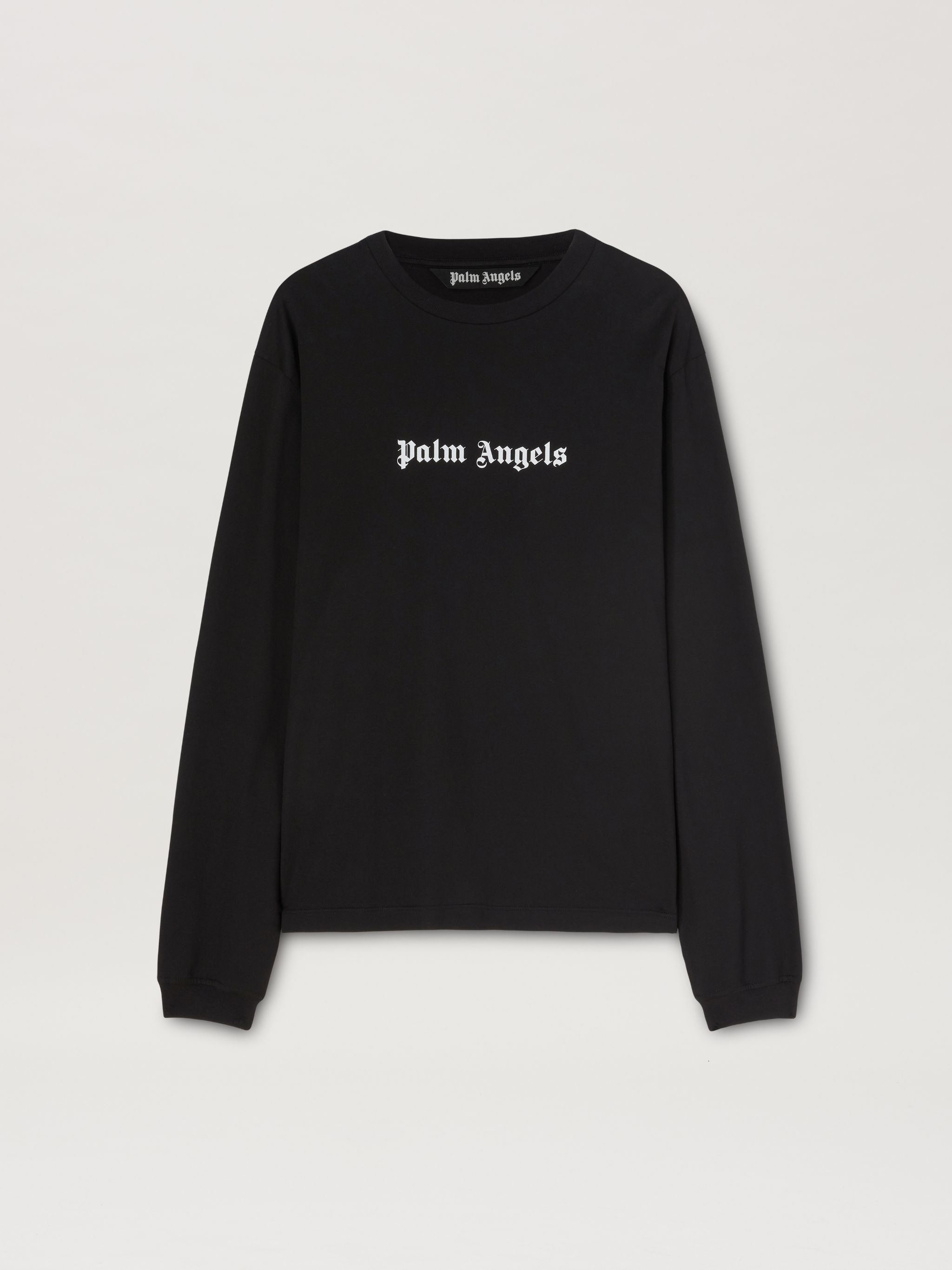 Men's long-sleeved black T-shirt with slim fit and classic Palm Angels logo printed in white on the chest. FABRIC 100% COTTON RIB DETAIL 100% COTTON MODEL MOHAMED WEARS SIZE M HEIGHT: 6’1" (185 CM) CHEST: 36" (92 CM) WAIST: 28" (73 CM) HIPS: 35" (89 CM) PRODUCT ID: PMAB046F23JER0021001