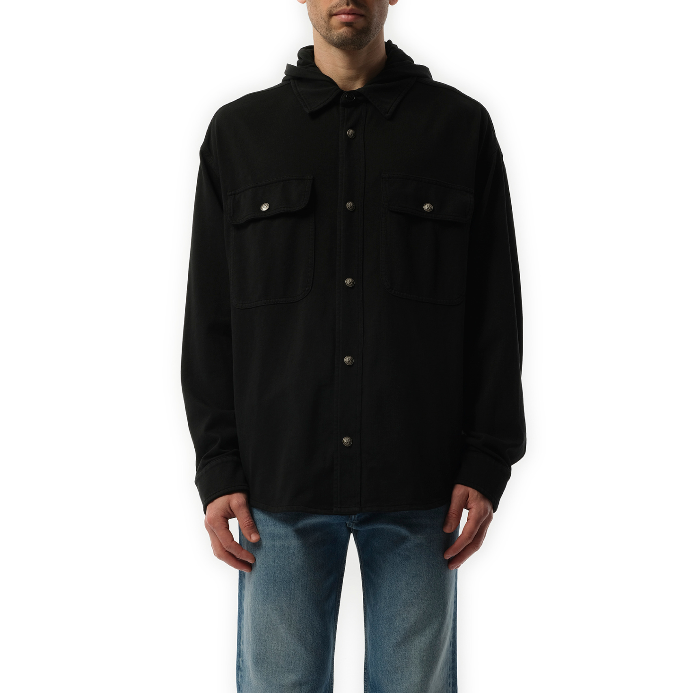 Stay stylish and warm with our GD Classic Logo Hooded Overshirt in Black/Black. Made with high-quality materials, this overshirt features a convenient hood and a classic GD logo. Perfect for a casual day out or a chilly evening, this overshirt is a must-have staple for any wardrobe. - Composition: 100% Cotton - Logo print to the rear - Front press-stud fastening - Long sleeves with press-stud fastening cuffs - Two chest flap pockets - Made in Italy Model is 192 cm and wears size 50 SKU: PMES021F24FAB0011010