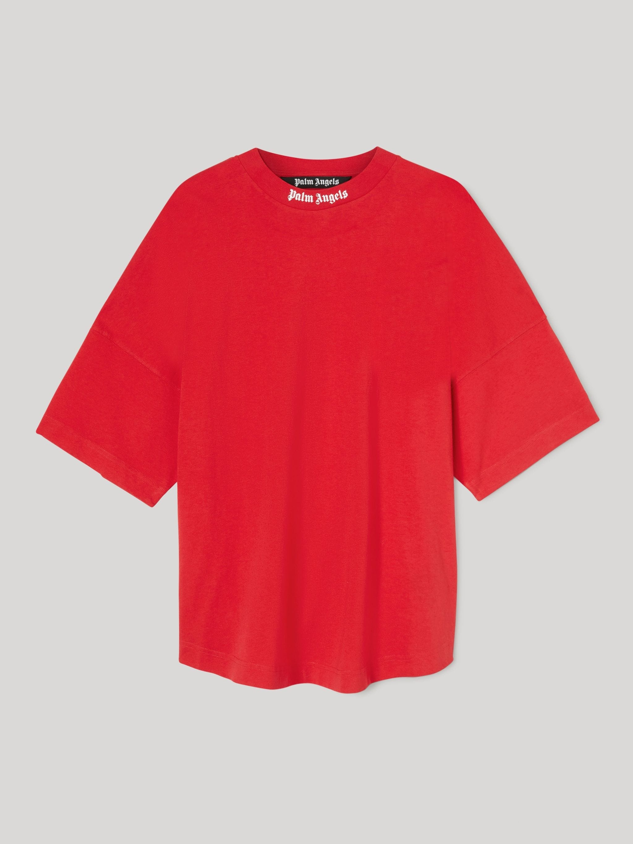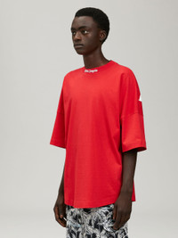 SHORTS SLEEVES T-SHIRT IN RED WITH "PALM ANGELS" LOGO PRINTED IN WHITE AT COLLAR AND AT BACK. CREWNECK COLLAR. OVERSIZE FIT. PRINT EXECUTED ON FINISHED GARMENT. THIS PARTICULAR PROCEDURE MAKES EACH GARMENT LOOKS DIFFERENT, THE PRINT IS IRREGULAR, EXPECIALLY NEAR THICKER AREAS WHERE THERE MAY BE FRAGMENTATION OR COLOUR BUILD UP. THESE DISTINGUISHING FEATURES ARE AN EFFECT THAT MAKE THIS GARMENT UNIQUE AND ARE NOT TO BE CONSIDERED FLAWS. THESE ASPECTS MAY CHANGE WITH GARMENT USE AND HANDLING. FABRIC 100% COTTON PRODUCT ID: PMAA002C99JER0062501