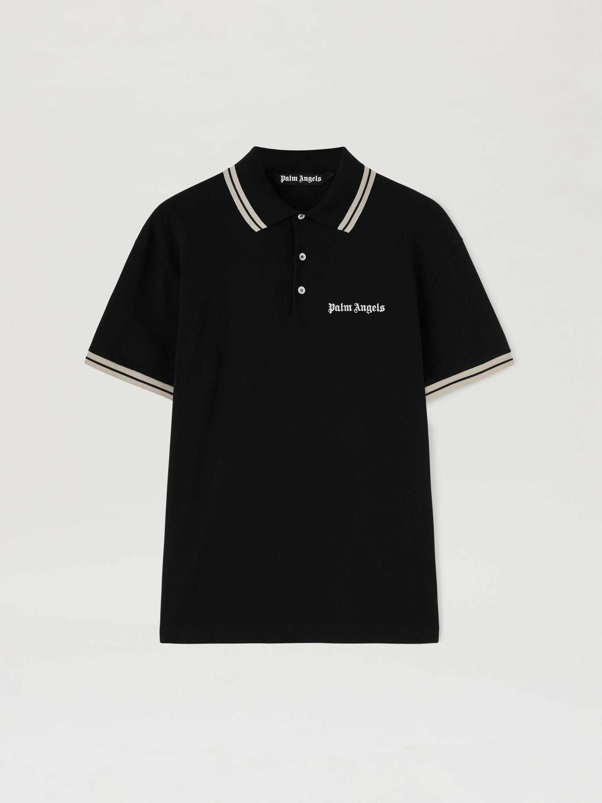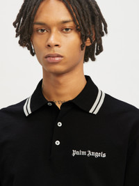 POLO SHIRT IN BLACK WITH BLACK AND WHITE STRIPES DETAILS AT SLEEVES AND SPREAD COLLAR. "PALM ANGELS" LOGO PRINTED IN WHITE AT FRONT. BUTTON CLOSURE. EMBROIDERY 100% POLYESTER - FABRIC 100% COTTON PRODUCT ID: PMGB012S23FAB0011001