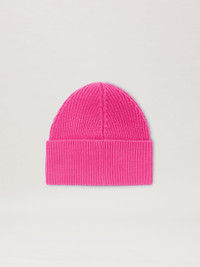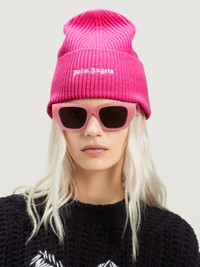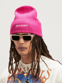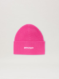 Fuchsia ribbed men's beanie, a multiple role player, featuring the classic Palm Angels logo fully embroidered in white on the front. FABRIC 50% WOOL 50% ACRYLIC EMBROIDERY 100% POLYESTER PRODUCT ID: PMLC030F23KNI0033201