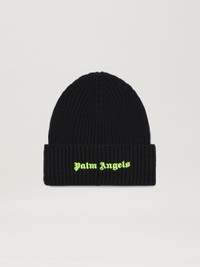 An all season essential. Men's black ribbed cuff beanie with logo Palm Angels embroidered in yellow fluo on the front. PRODUCT ID: PMLC030F24KNI0051065