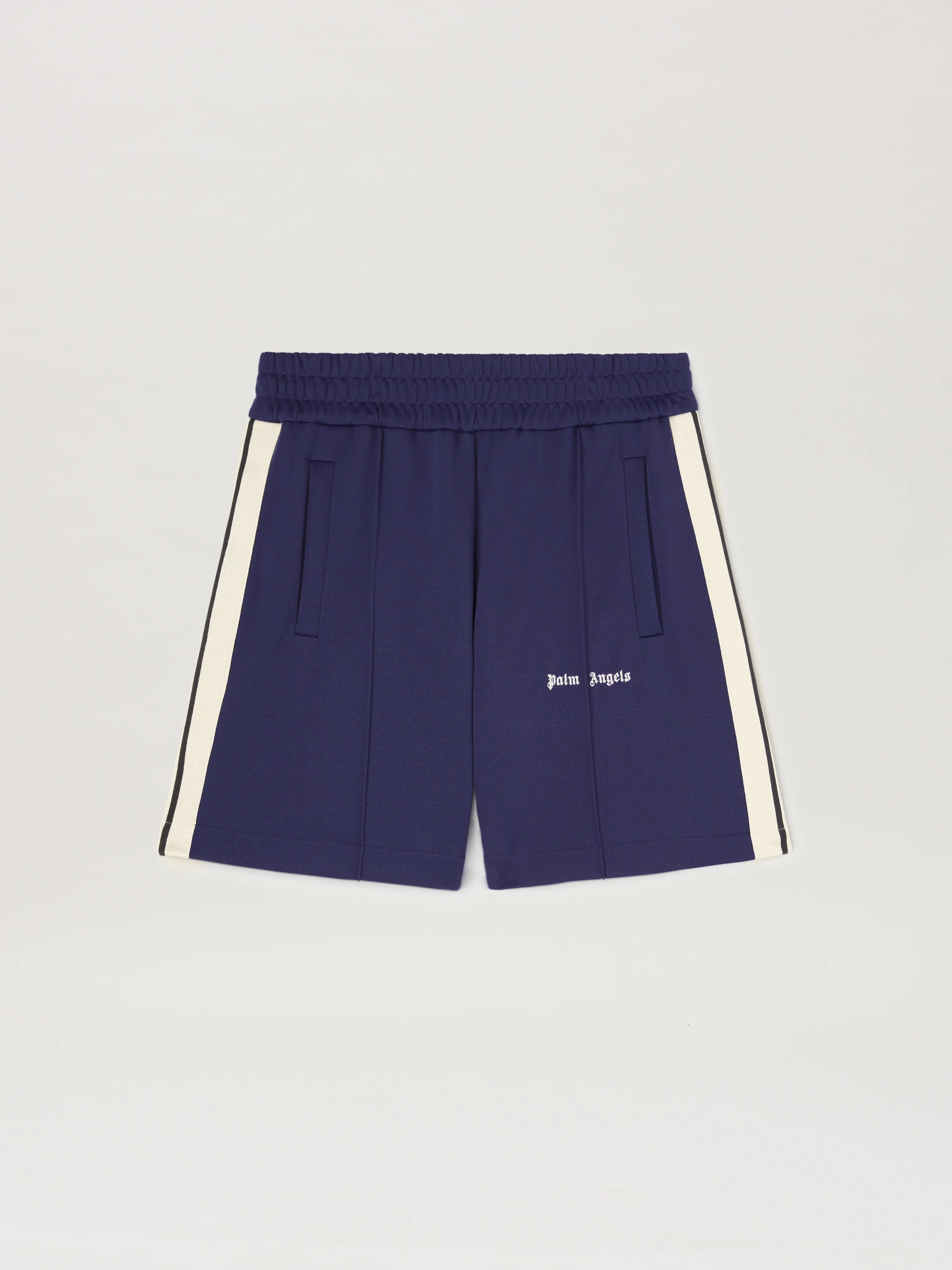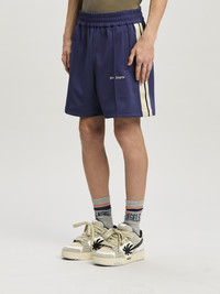 A blend of comfort and style, suitable for different styling. Men's navy blue tracksuit shorts with elastic waist, vertical pockets, ecru side bands and logo Palm Angels embroidered in white on left leg. PRODUCT ID: PMCL004C99FAB0014603
