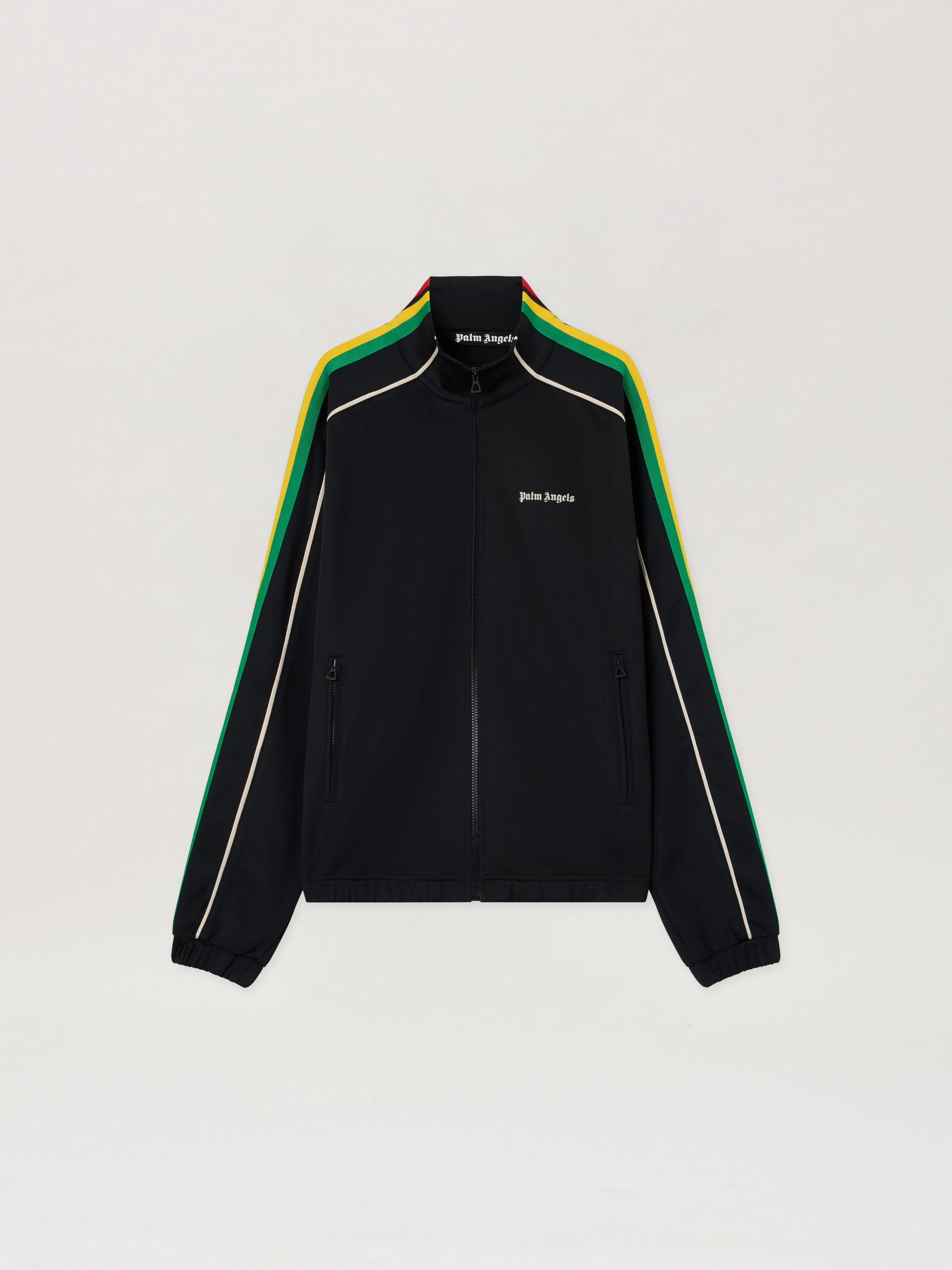 An iconic Palm Angels staple, the track jacket embodies the brand’s unmistakable sporty attitude. Designed with a standing collar and full front zip closure, it features the signature contrasting bands running along the sleeves and a Classic Logo print on the chest, reinforcing an heritage-inspired aesthetic and instantly recognizable identity. - Standing collar - Full front zip closure - Classic Logo print on the chest - Contrasting track bands and trim along the sleeves - Two side zip pockets - Ribbed neck, hem and cuffs DETAILS - Material: 100% Polyester - Code: PMBD08NS26FAB0021003