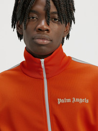 CLASSIC TRACK JACKET IN BRICK RED ACETATE FABRIC WITH WHITE "PALM ANGELS" LOGO PRINTED AT FRONT. RIB KNIT CUFFS, COLLAR AND HEM. FRONT AND POCKETS WHITE ZIP. ICONIC BLACK AND WHITE TAPEON THE SLEEVES. SLIM FIT. FABRIC 100% POLYESTER - LINING 100% POLYESTER - RIB DETAIL 4% ELASTAN 96% POLYESTER - DETAIL 100% POLYESTER PRODUCT ID: PMBD001F22FAB0022703