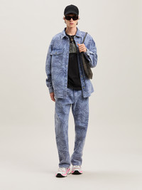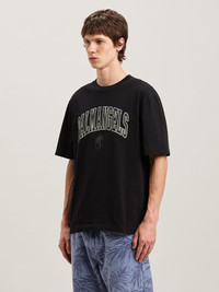College aesthetic applied to key icons giving a fresh take. Men's slim fit black T-shirt with vintage black College-style logo and Oval Palm printed on front. DETAILS - Manuel Wears Size MHeight: 6' 1” (185 Cm) Bust: 34.5” (87 Cm) Waist: 26” (66 Cm) Hips: 33” (85 Cm) Fabric 100% CottonRib Detail 100% Cotton - Code: PMAA089S25JER0011013