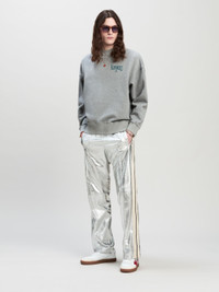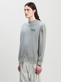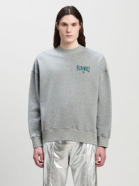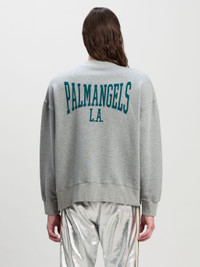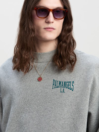 College graphics lend an “Ivy League” feel to garments and accessories. Men's grey melange crewneck sweatshirt with college-flavored small Palm Angels LA lettering in petrol printed on the front and big Palm Angels LA lettering printed in petrol blue on the back. LORENZO WEARS SIZE M HEIGHT: 6' 2" (189 CM) BUST: 36" (92 CM) WAIST: 28" (71 CM) HIPS: 34"" (86 CM) PRODUCT ID: PMBA026F24FLE0080848