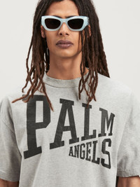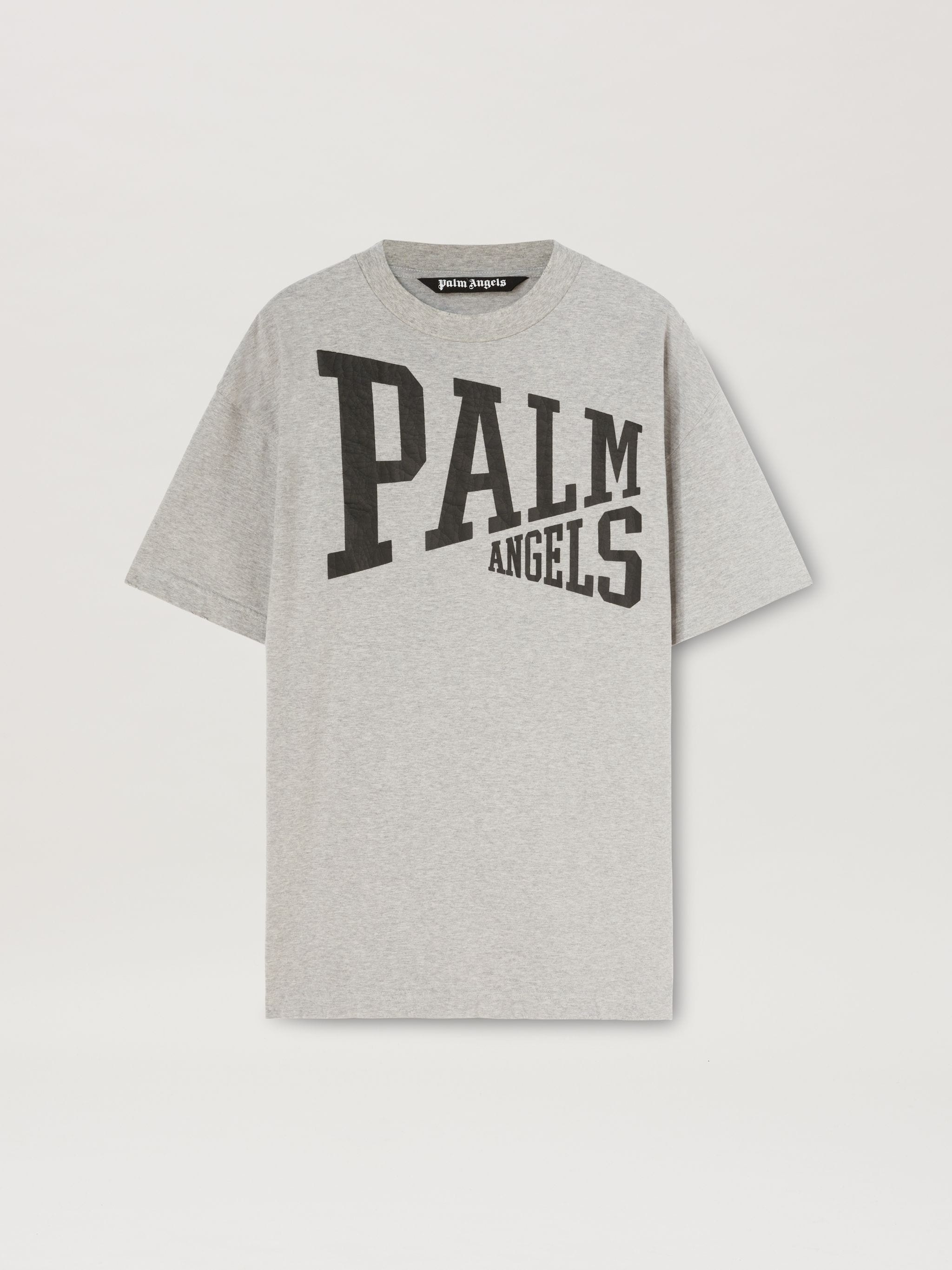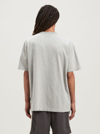 Men's gray short-sleeved T-shirt with regular fit and distressed details, special graphic with varying size letters printed on the front in black. FABRIC 100% COTTON MODEL MOHAMED WEARS SIZE M HEIGHT: 6’1" (185 CM) CHEST: 36" (92 CM) WAIST: 28" (73 CM) HIPS: 35" (89 CM) PRODUCT ID: PMAA072F23JER0020910