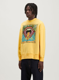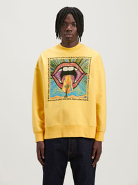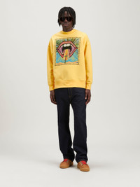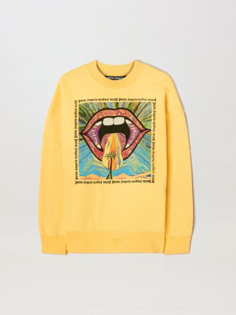 Men's ocher yellow crewneck sweatshirt with loose fit and multicolored "Kaleidoscopic Mouth" print on the front framed all around by the Palm Angels logo in black. FABRIC 100% COTTON MODEL PAOLO WEARS SIZE M HEIGHT: 6’2" (188 CM) CHEST: 33'' (85 CM) WAIST: 28'' (71 CM) HIPS: 36" (91 CM) PRODUCT ID: PMBA065F23FLE0041684