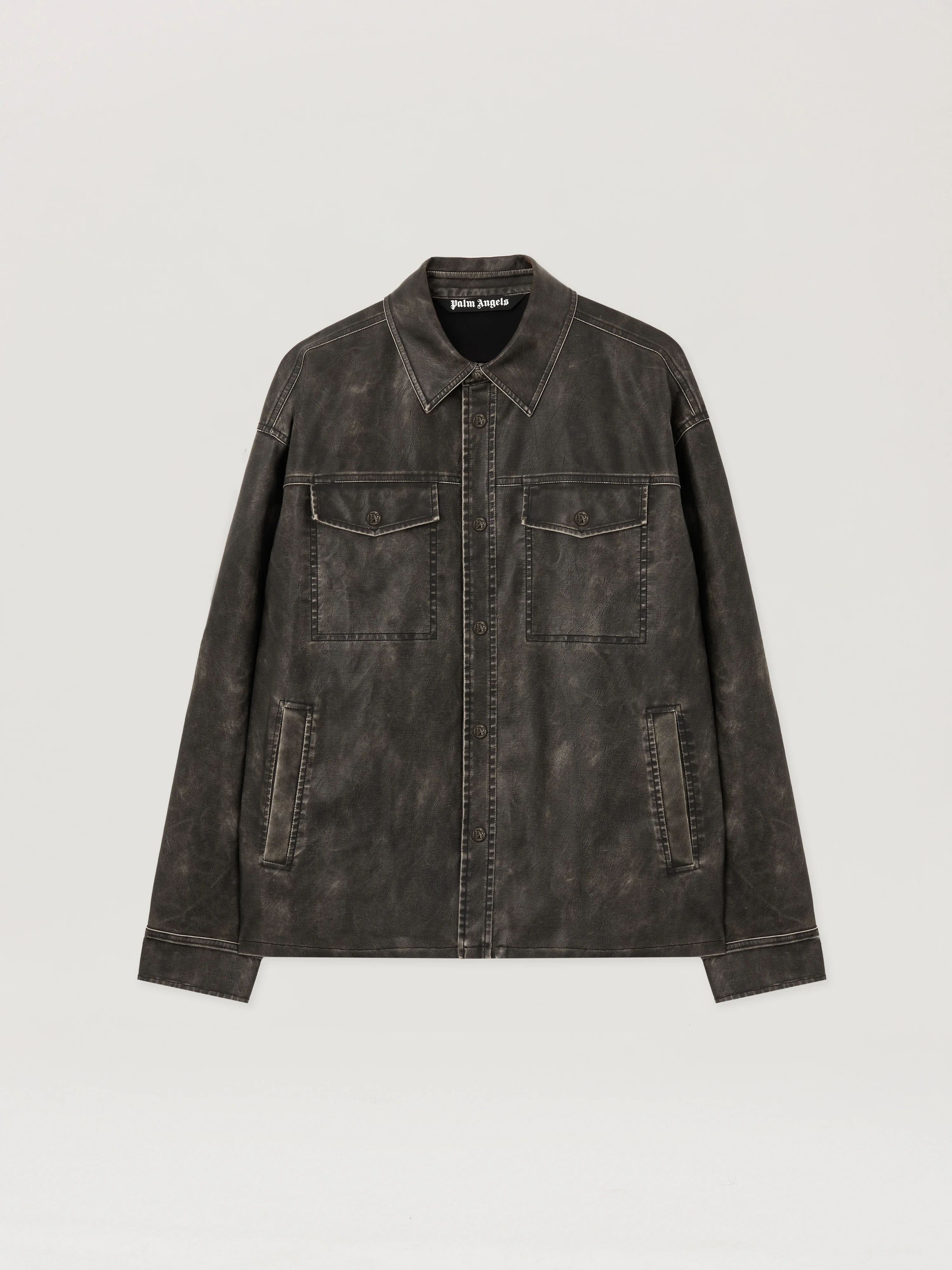 Coated overshirt featuring a curved logo design, crafted with a refined finish and a button-down front. - Distinctive coated texture for an elevated look - Button-down front closure - Curved logo detailing at the back - Structured long sleeves - Front chest pockets with flap - Classic shirt collar - Buttoned cuffs DETAILS - 68% Polyurethane 27% Viscose 5% Altre fibre, Lining: 100% Viscose - Code: PMJE015F25FAB0010710