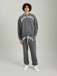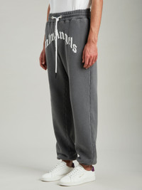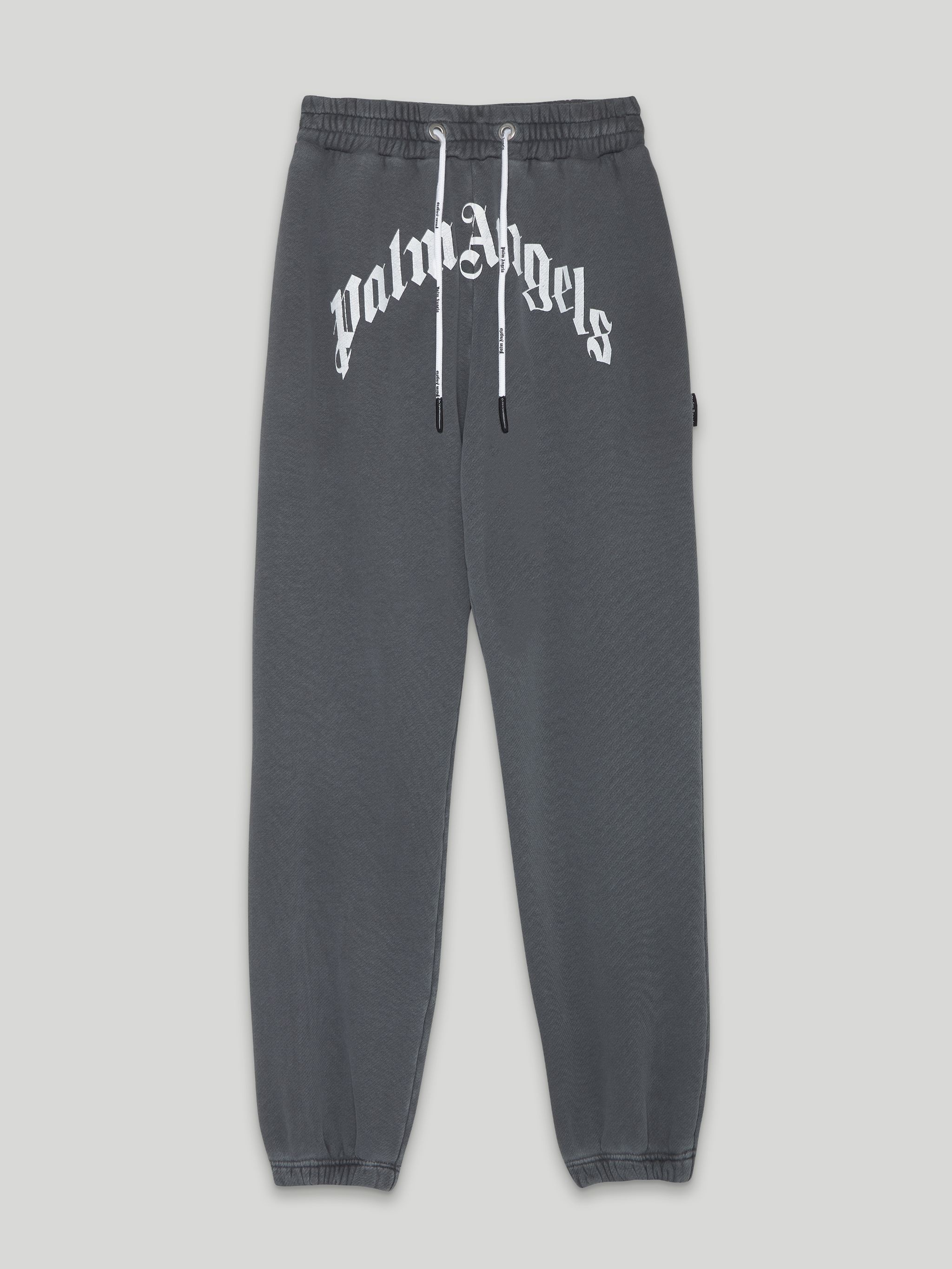 Long sweatpants in grey with "Palm Angels" curved logo printed in white at front. Elasticized waistband featuring white drawstrings. Side pockets. Model Callum wears size M Height: 6'2 (189 cm) Chest: 36" (91 cm) Waist: 30" (76 cm) Hips: 35" (89 cm) PRODUCT ID: PMCH011F21FLE0021001
