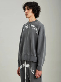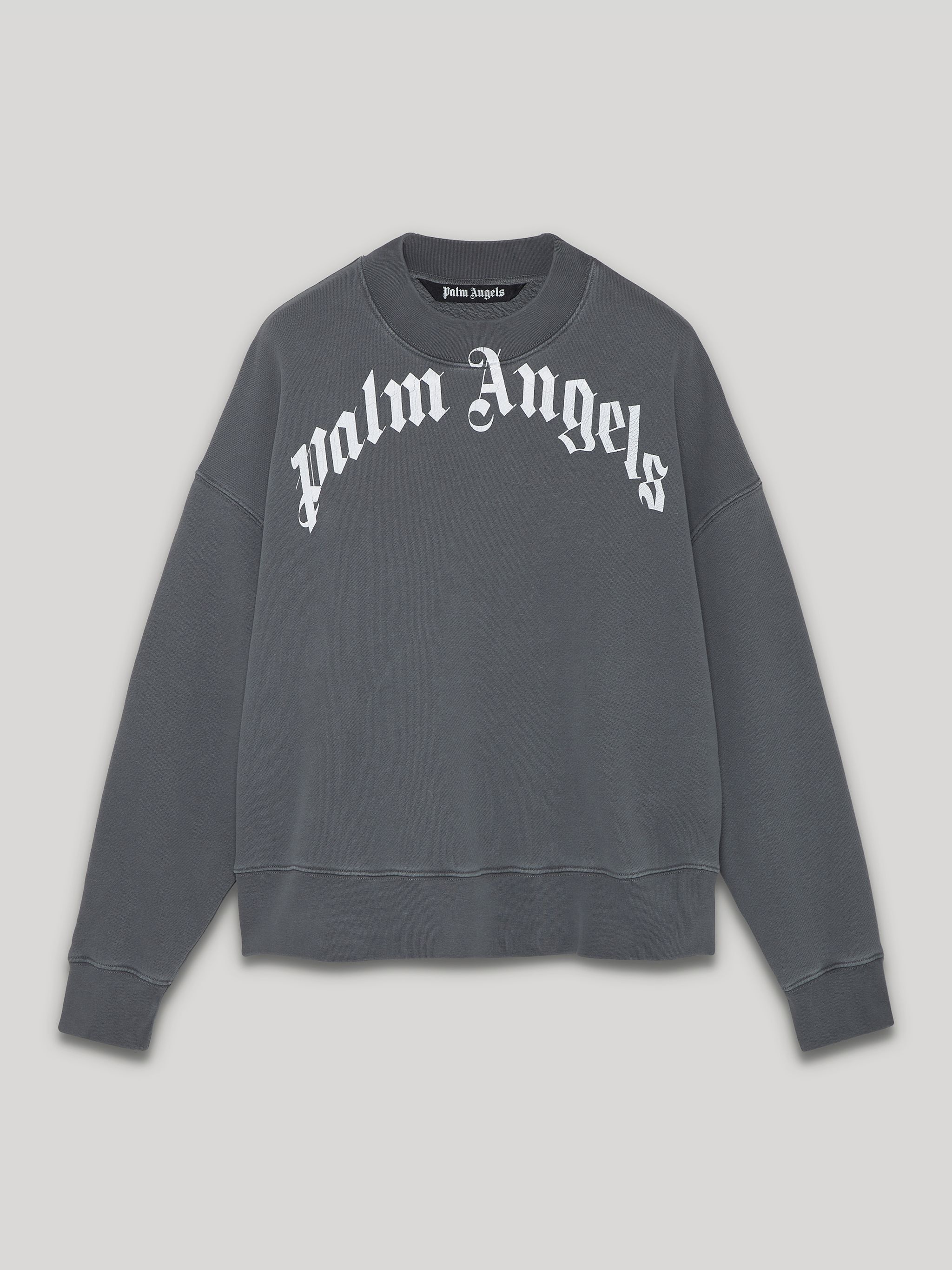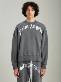 Long sleeves sweatshirt in grey with "Palm Angels" curved logo in white printed at front. Crewneck collar. Rib knit cuffs, hem and collar. Model Callum wears size M Height: 6'2 (189 cm) Chest: 36" (91 cm) Waist: 30" (76 cm) Hips: 35" (89 cm) PRODUCT ID: PMBA026F21FLE0041001