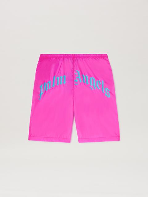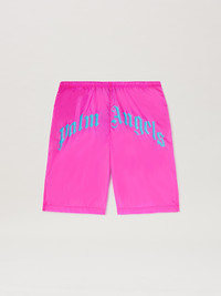 Performance fabrics interesecting the leisure sphere. Men's fuchsia swimshorts in shiny nylon with elastic waistband and Curved logo printed in light blue on the front. DETAILS - Fabric 100% Polyamide - Code: PMFD018S25FAB0013240